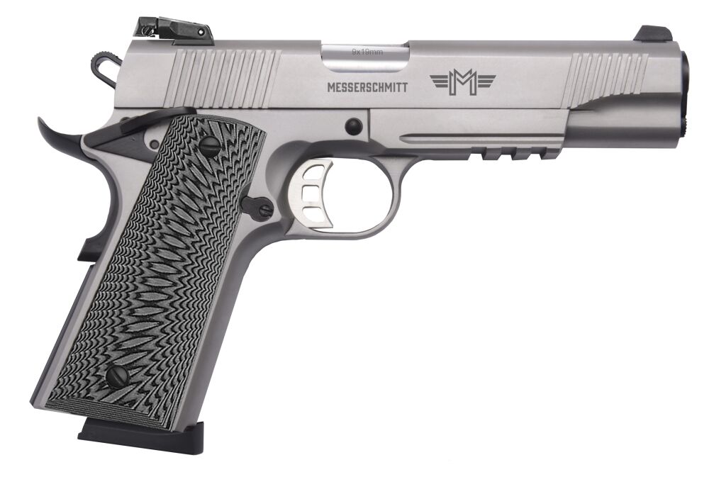 Die neue Messerschmitt 1911 ist im klassischen 1911er Look. Die Pistole ist im Kaliber 9 mm Luger und im Kaliber .45ACP erhältlich in jeweils Schwarz und Silber. Die Waffe kommt mit einer höhen- und seitverstellbaren 3 Punkt LPA Visierung.