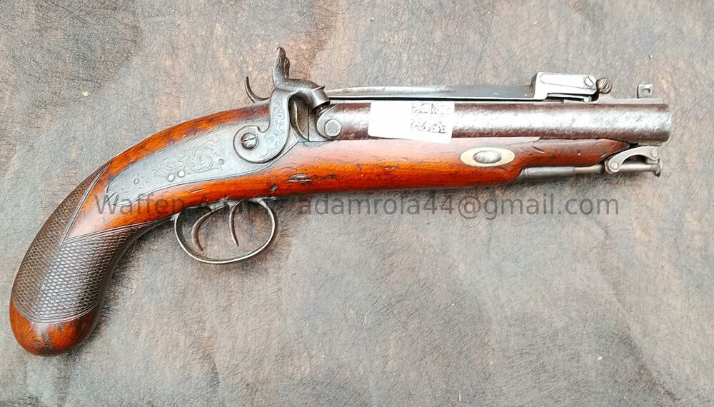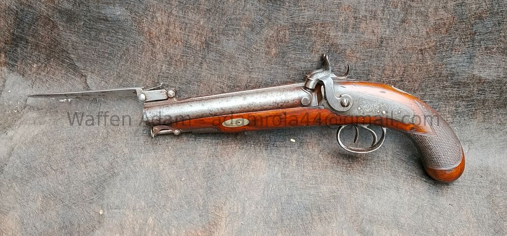 Um 1840 - interessante Doppelläufige englische Reisepistole mit Klappbajonett, heraus springend. Kaliber 14 mm glatt. Guter Zustand. Vorderlader. Rückliegende Seitenschlosse, Nussholz Schaft mit Fi... ...weiterlesen