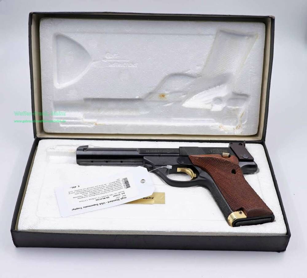 ungeschossen aus Sammlungsauflösung, hochwertige Ganzstahl-Sportpistole mit verstellbarem Visier, Triggerstop, vergoldete Bedienteile, steiles Griffstück, wie bei Großkaliberpistolen, daher perfekte Trainingswaffe dafür, Holzgriffschalen für Rechtshänder mit Dauemnauflage, noch im Originalkarton, mit aktuellem CIP-Beschuss.....ein Stück zum Sammeln und Schießen...EUR 495,-