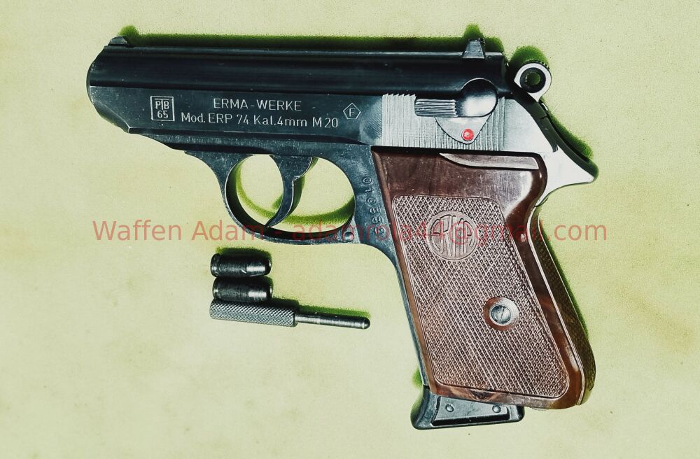 Aus Sammlerhand: Erma Repetier Pistole ERP 74 im Karton, ähnlich der Walther PPk, Kaliber 4mmM20, F im Fünfeck, PTP 65 links am Schlitten gemarkt. Interesannte Konstruktion - Repetier und Ausziehfu... ...weiterlesen