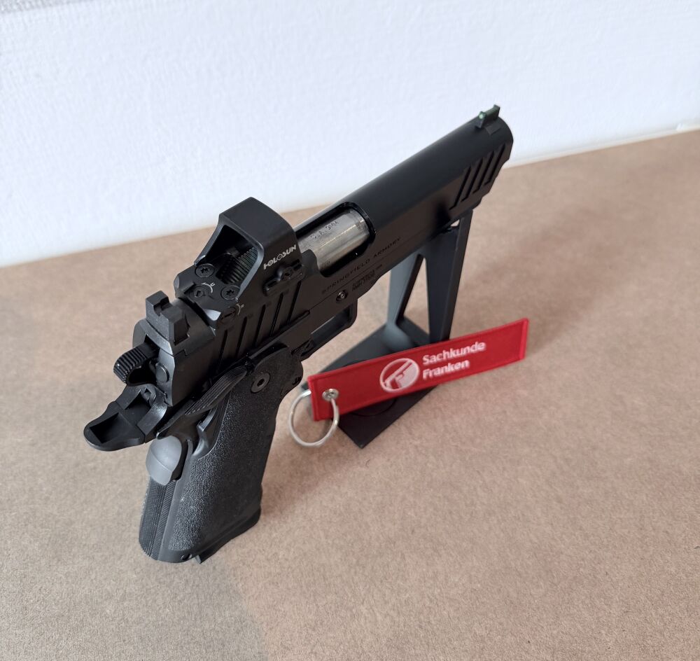 Es wurde bereits ein Holosun HE407K-GR Grünpunktvisier montiert, das eine sehr schnelle Zielaufnahme ermöglicht. Die Pistole wird somit komplett "ready for the range" und sofort einsatzbereit angeboten. Zusätzlich ist ein Protection Cover für das Holosun im Lieferumfang enthalten.