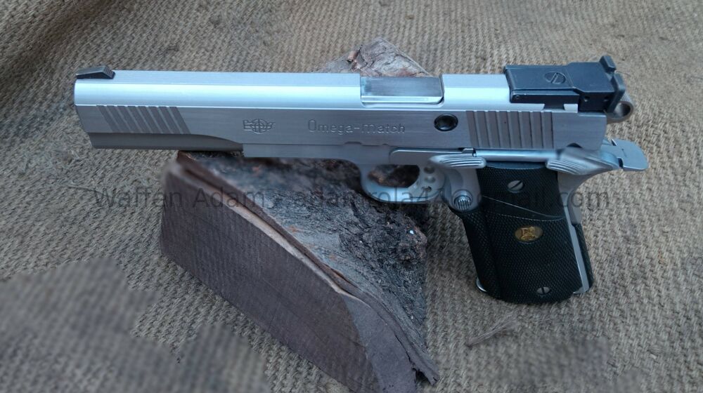 Sport Pistole, Peters Stahl Omega Match im Kaliber.45 Auto. Ganzstahlwaffe Stainless Steel, 6 Zoll Lauflänge, Micro Meter Visier und Balkenkorn. Durchgehende Laufschiene. Matchabzug mit Triggerstop. E... ...weiterlesen