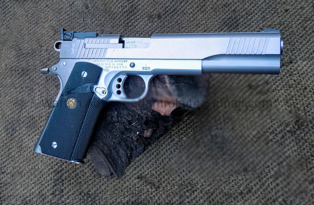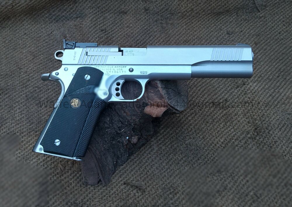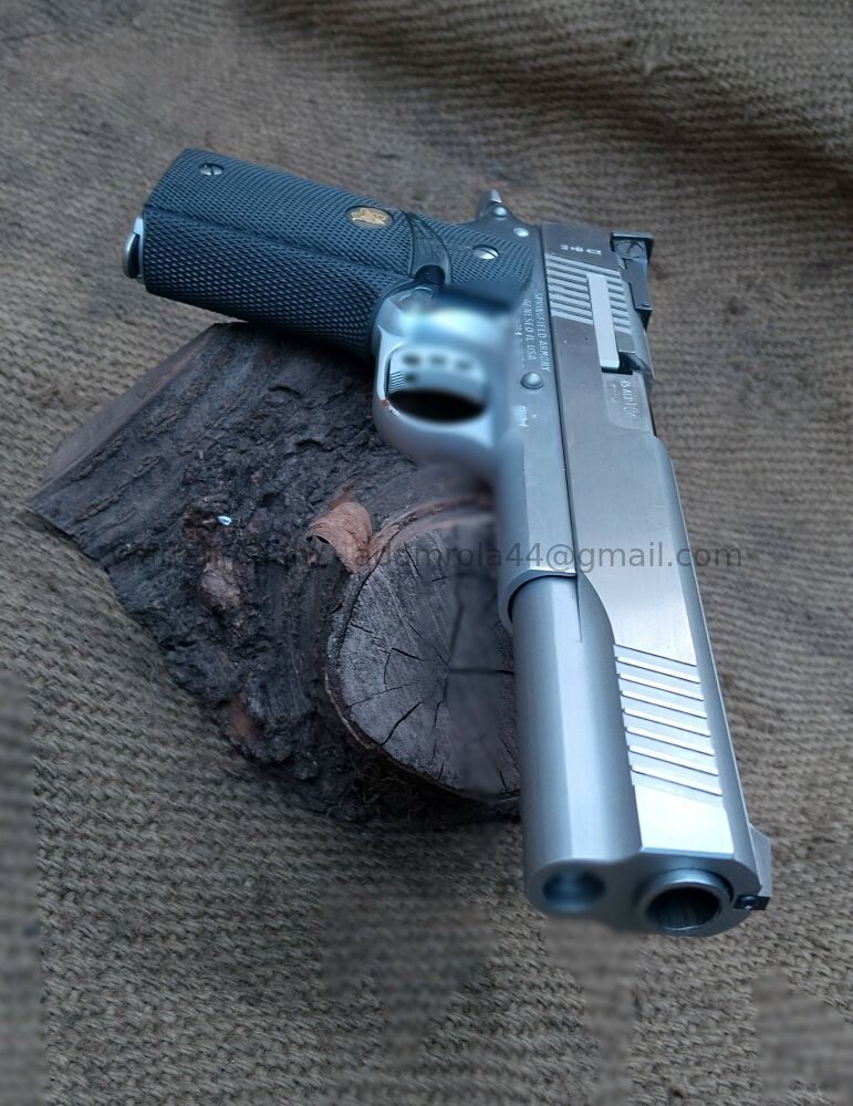 Sport Pistole, Peters Stahl Omega Match im Kaliber.45 Auto. Ganzstahlwaffe Stainless Steel, 6 Zoll Lauflänge, Micro Meter Visier und Balkenkorn. Durchgehende Laufschiene. Matchabzug mit Triggerstop. Extended Slide Release, extended Safety, Beavertail. Nahezu neuwertiger Zustand. Pachmayr  WA-Sportgriff mit Fischhaut.  Gebrauchtwaffe mit altersbedingten Kratzern und Flecken, Bilder sind Bestandteil der Beschreibung, Irrtum vorbehalten.