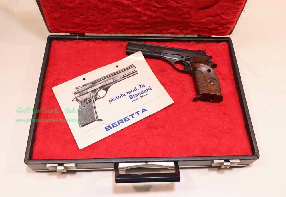 selten geschossene Schrankwaffe, mit SA-Matchabzug und außenliegendem Hahn, und zusätzlicher Sicherung, Laufbereich in original reflexfreiem Finish, Holzgriffschalen mit Daumenauflage für Rechtsschützen, mit herausnehmbarem 10+1 Schuss Stahlmagazin, im Kunstlederkoffer mit Bedienungsanleitung.....zuverlässige, sportliche Universalpistole (für DJV-Pistolenschützen perfekt)....