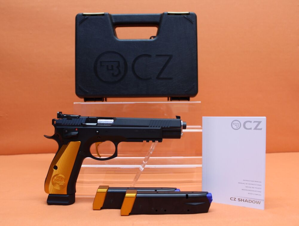 6"/152mm Lauf, Sportkorn, LPA-Mikrometervisierung, CZ 75 SP-01 Griffstück mit langem Dustcover und Zubehörschiene (Picatinny), SAO Abzug (ca. 16N) mit Triggerstop/ Abzugstuning (OHNE Schlagbolzensicherung), vergrößerter Schlittenfang-/ Sicherungshebel (beidseitig), verlängerter Magazinhalter, SAO-Hammer, orangefarbene Alu-Griffschalen/ Magazinboden/ Abzugszüngel, 19-Schuß Magazin. Incl. 2 St. Reservemagazin. Kunststoffkoffer als Transportverpackung.
