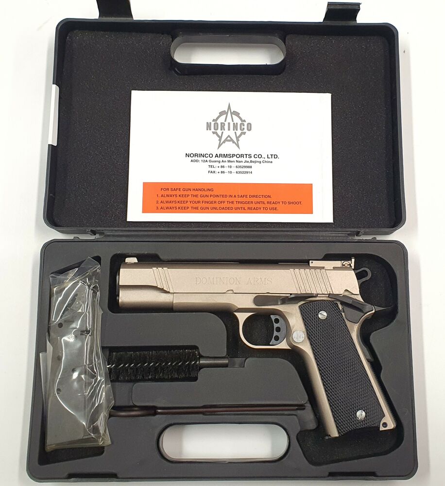 Neuwaffe: Pistole NORINCO Mod.1911A1 SPORT DOMINION ARMS im Kaliber 45ACP matt verchromt Inkl. Zubehör mit Hartverchromten Lauf, verstellbare Visierung, Langer Verschlussfanghebel, Langer Sicher... ...weiterlesen