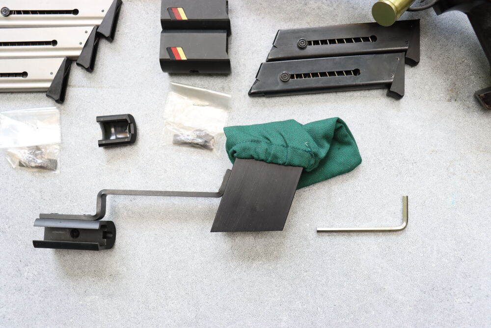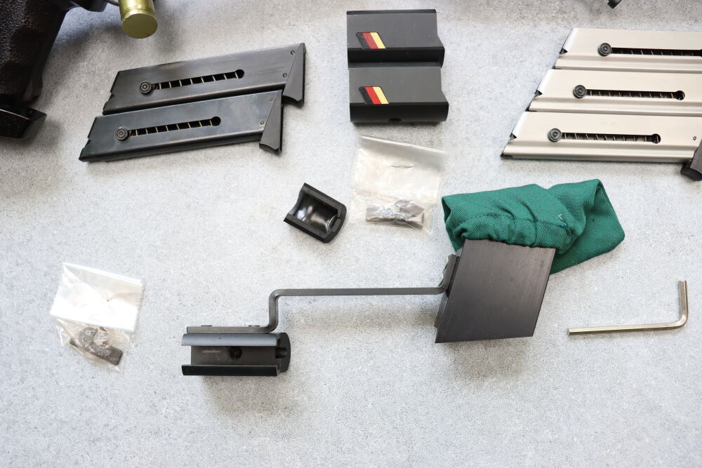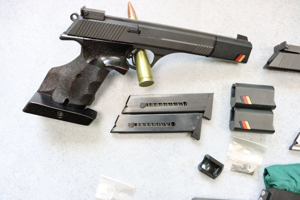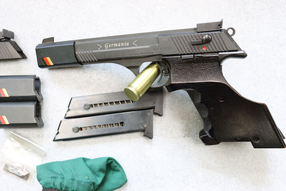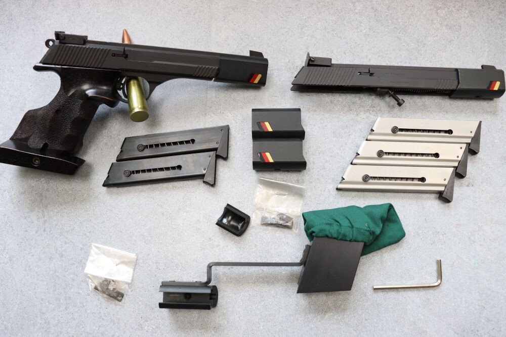 Sportspistole Erma ESP85 A im Kaliber .32S&W Long WC + 2 Magazine Laufgewichte Wechselsystem Erma ESP 85 A im Kaliber .22lr + 3 Magazeine Hülsenfangbeutel Sondermodel Germania ...weiterlesen