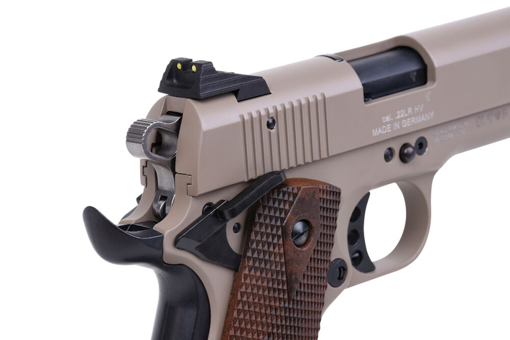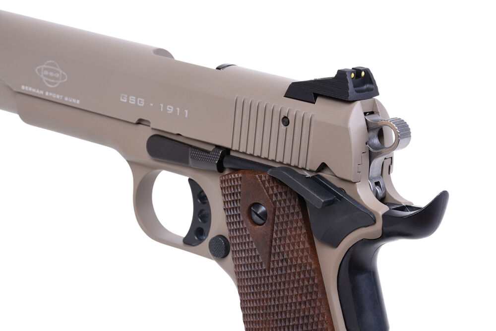 Die GSG-1911 Selbstladepistole im Cal. .22 aus Vollmetall mit Holz-Griffschalen und kompletter Beschichtung in US TAN im klassischem 1911-Full Size-Format verfügt über eine Magazin-, Fall- und Schlagbolzensicherung, eine beidseitige Drehhebelsicherung, eine Handballensicherung, einen einstellbaren Triggerstop und einen gelochten Abzug (Single-Action).