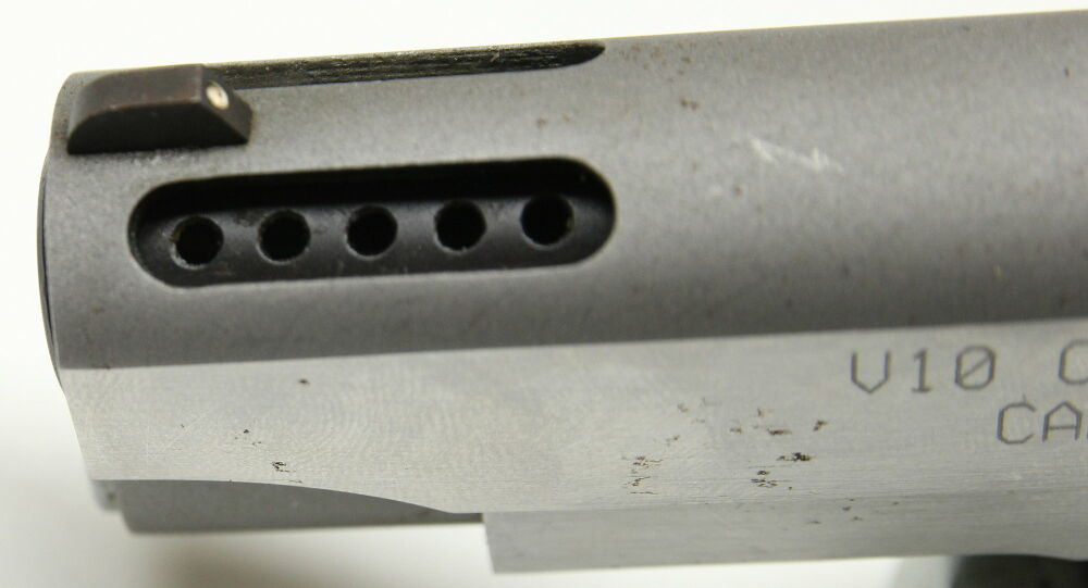 Springfield 1911 V10 Kal. 45ACP mit Compensator gegen Hoch und Rückschlag, Lauflänge 4 Zoll, Edelstahl, durch das Kaliber und die führige Größe, die perfekte Fangschusswaffe.