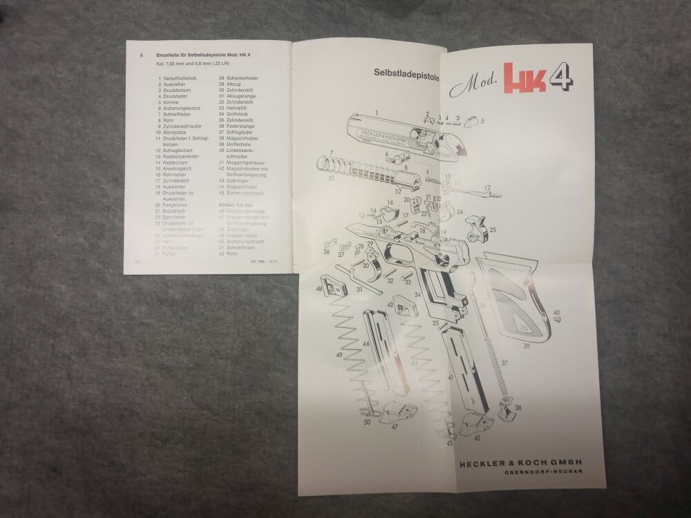 Original Bedienungsanleitung für Heckler & Koch Modell HK 4 22lr / 7,65mm Browning 28 Seiten + Explosionszeichnung A4 gedruckt 1973 ...weiterlesen