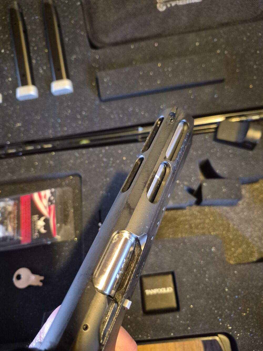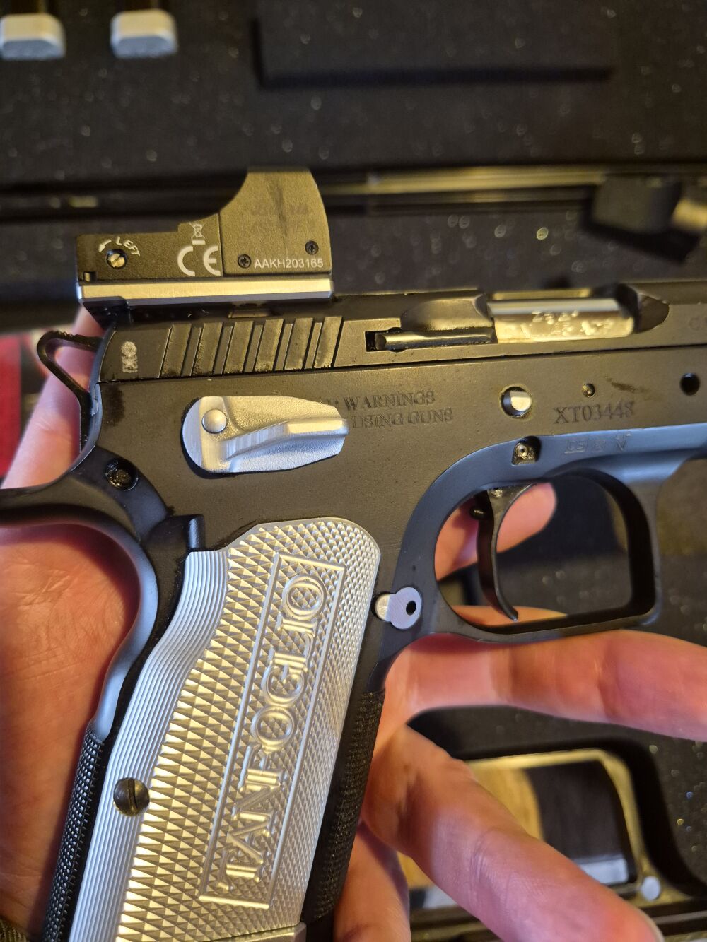 Halbautomatische Pistole, Tanfoglio Limited Custom Xtreme im Kaliber .45ACP, Werkstuning, die Top-Variante von Tanfoglio, super Zustand mit Rotpunkt Burris Fast-Fire 2, in Summe vier Magazine im original Koffer