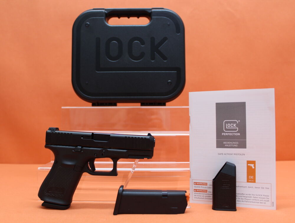 102mm GMB (Glock Marksman Barrel) Lauf, Verschluß mit Front Serrations, verstellbare Polymer-Kontrastvisierung, Gen5 RTF Polymer-Griffstück mit Zubehörschiene (Weaver)/ angetrichterter Magazinschacht, Gen4 Magazinhalter (li/re umbaubar), beidseitiger Verschlussfanghebel, Safe Action Abzug ca. 20N (teilvorgespannt, 2,0kg Steuerfeder), 13-Schuss Magazin (47823). Incl. 2 St. auswechselbare Griffrücken/ Reservemagazin/ Ladehilfe/ Putzstock/ Putzbürste. Kunststoffkoffer als Transportverpackung.