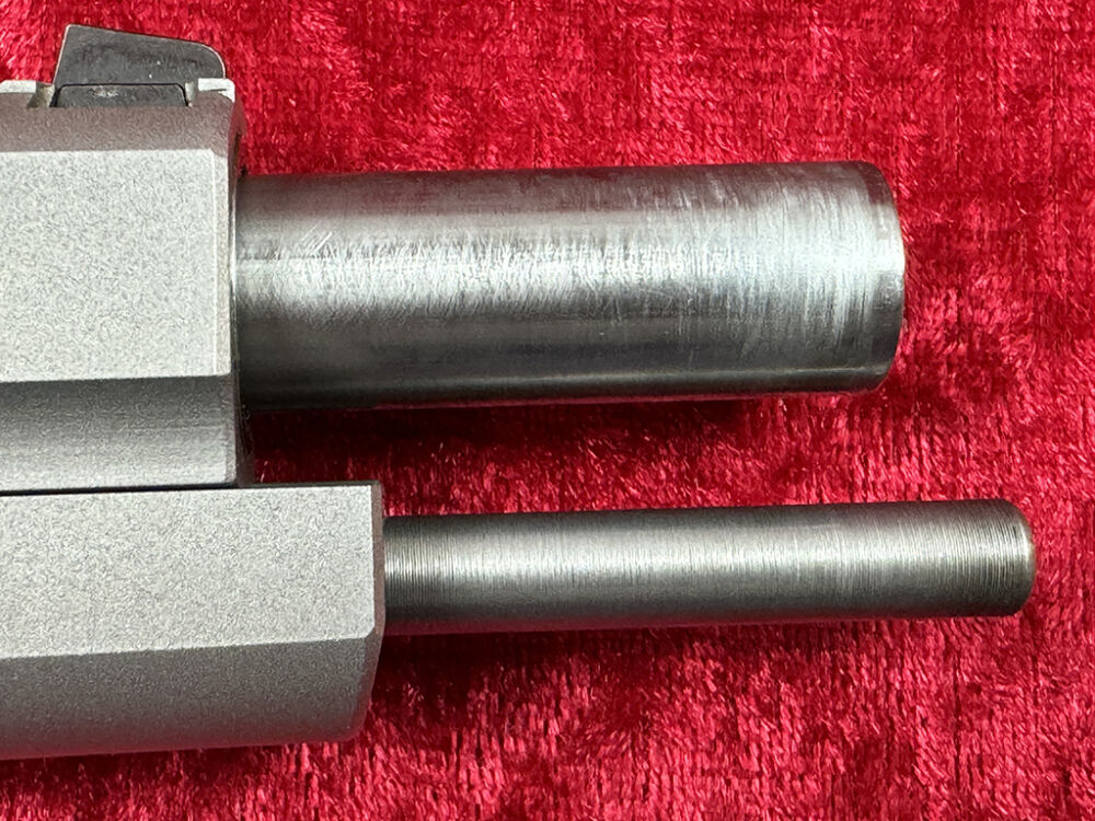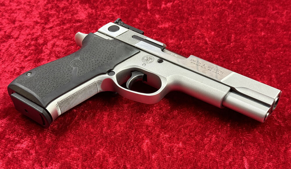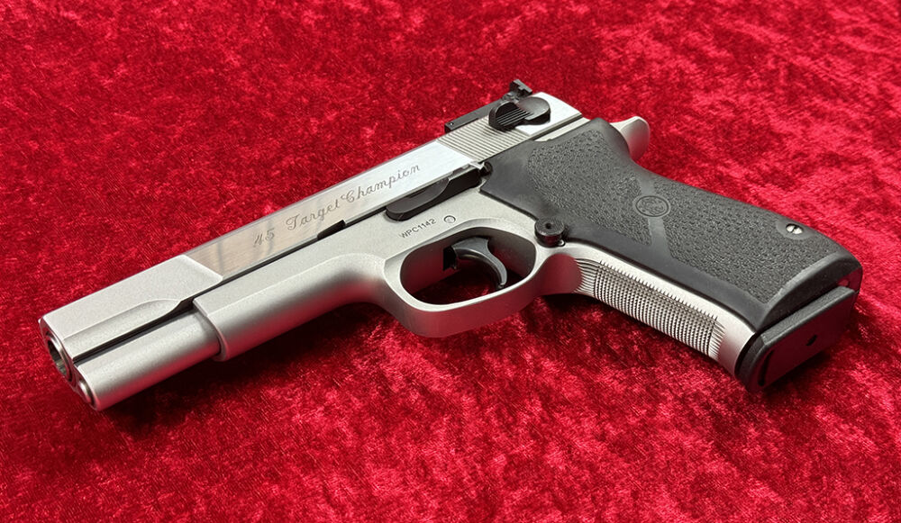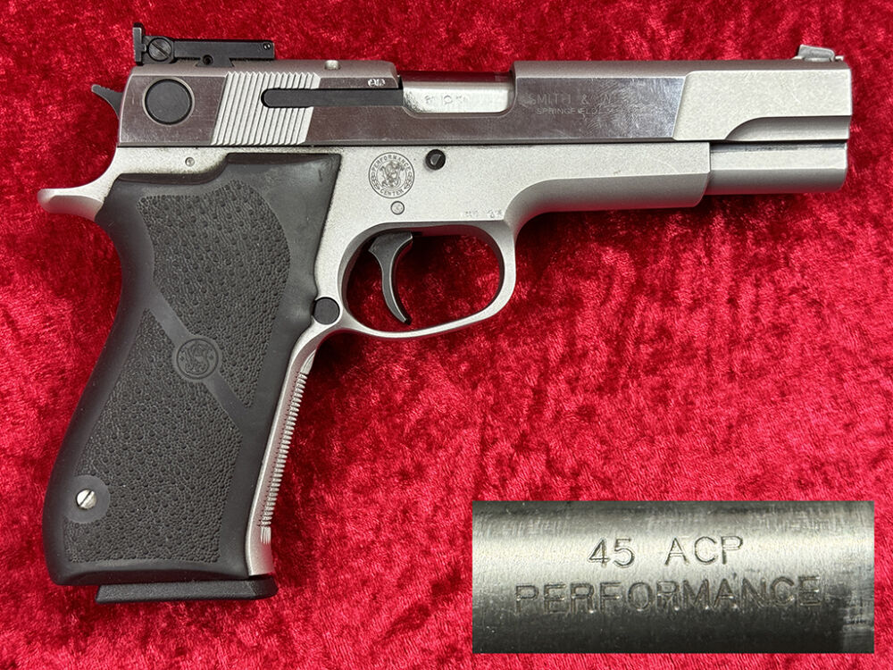 Diese Smith & Wesson, 845 stammt von einem Waffensammler, der kaum geschossen hat. Der Abzug der Waffe ist ein Traum. Bei dieser 845 hat der Sportschütze keine Ausrede mehr. Sie hat einen 12,5 cm (5 Zoll) Lauf. Die Pistole wurde laut Seriennummer WPC1142 wohl 1999 produziert, im Performance Center überarbeitet, von der Firma Wischo importiert und in Belgien beschossen. Es war eine der Letzten WPC Nummern (bei WPC1161 war Schluß). Bei dieser Waffe ist ein neuer Lauf eingebaut worden.