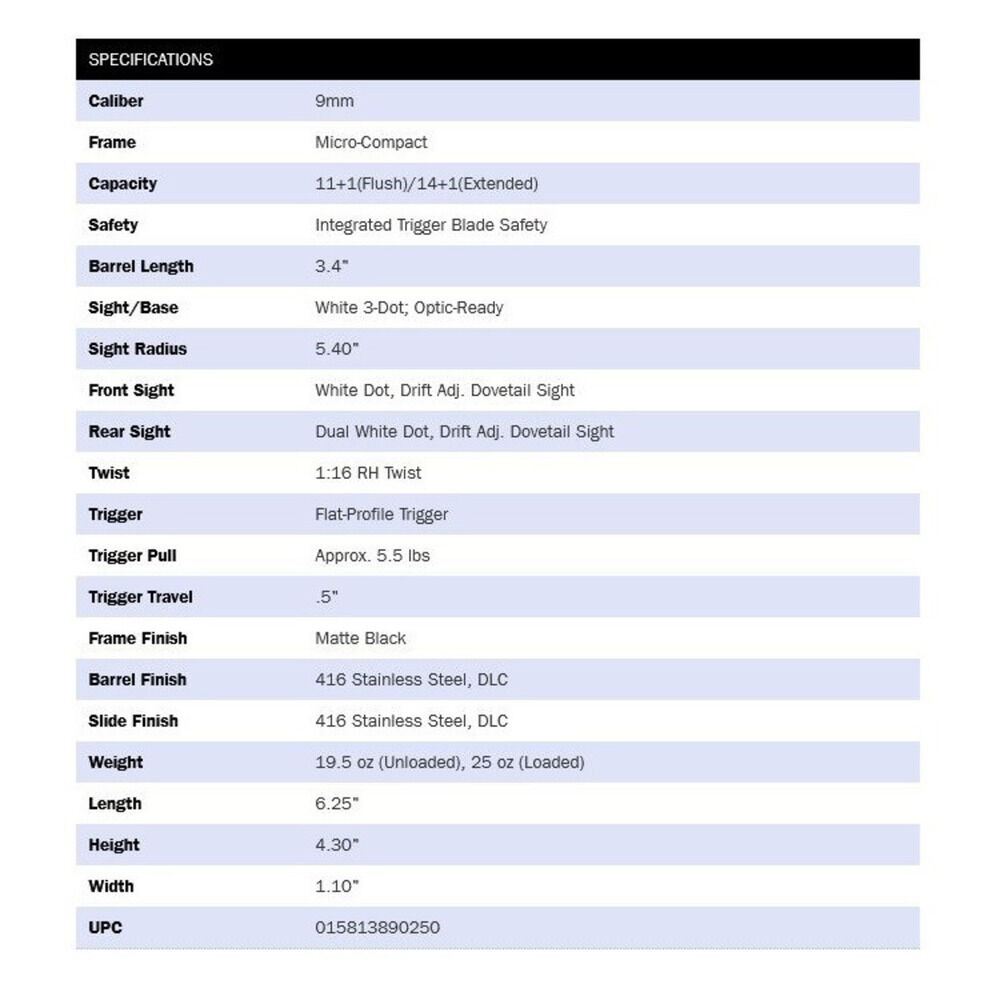 Kaliber 9mmLuger, ha.Pistole Modell MC2sc Micro-Compact Optic-Ready schwarz brüniert matt 11+1(14+1) Patronen, Lauflänge 3,4"/8,6cm, Visierung 3-Dot weiß fix, Abzugssicherung, Abzugsgewicht ungefähr bei 5,5lbs/2.497gramm ab Werk, mit 1/einem Magazin 11 Patronen schwarz und 1/einem Magazin 14 Patronen schwarz mit Verlängerung, Gesamtgewicht 19.5oz/553gramm ohne Munition, Gesamtlänge 6,25"/15,9cm, mit Kabelschloss und Bedienungsanleitung, Code 89025 Mossberg USA. Preis gültig für 1/eine Pistole Code 89025! - Neu 2022