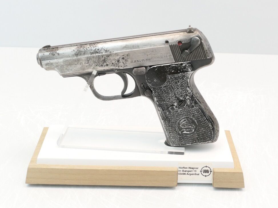 J.P. Sauer & SohnPistole Modell 38HBeschussjahr: 1939-1945Kaliber: 7,65mm Abzug: DA inkl. Magazin und Holster.Original Griffschalen, die linke Griffschale hat einen reparierten Riss.Funktion geprü... ...weiterlesen