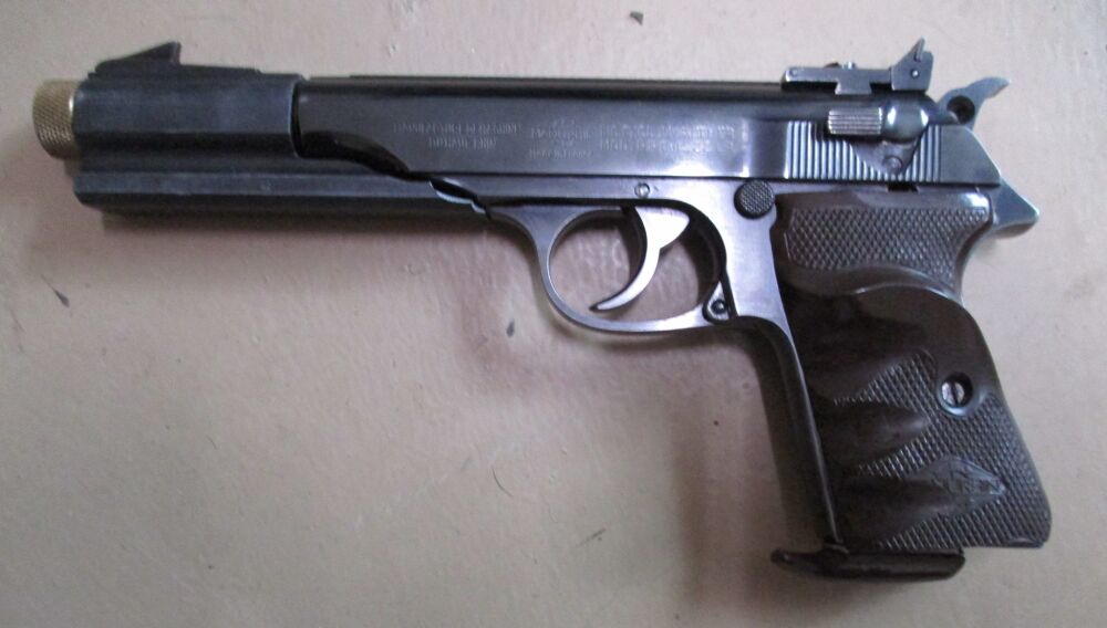 Pistole Walther PP Sport, PP mit langem Lauf und vorversetzem Korn. Griffschalen leider bearbeitet.