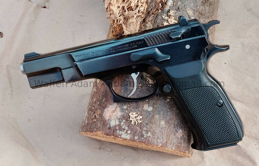 Tanfoglio TA90 Halbautomatische Pistole, Ganzstahlwaffe hochwertige Qualität. Doppelreihiges Stangenmagazin. Schlagbolzen Flügelsicherung mit Entspannfunktion. Nahezu neuwertiger Zustand, blanker Lauf... ...weiterlesen