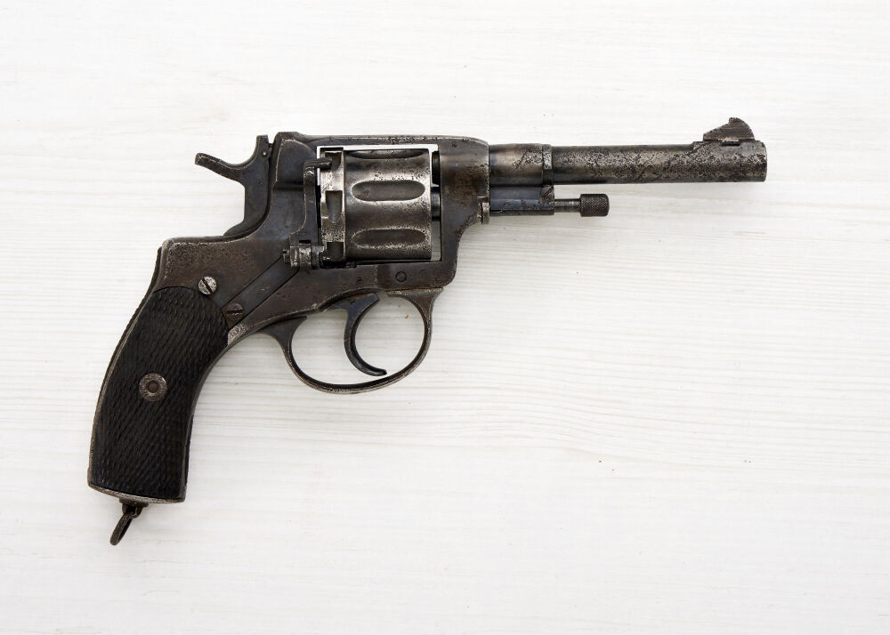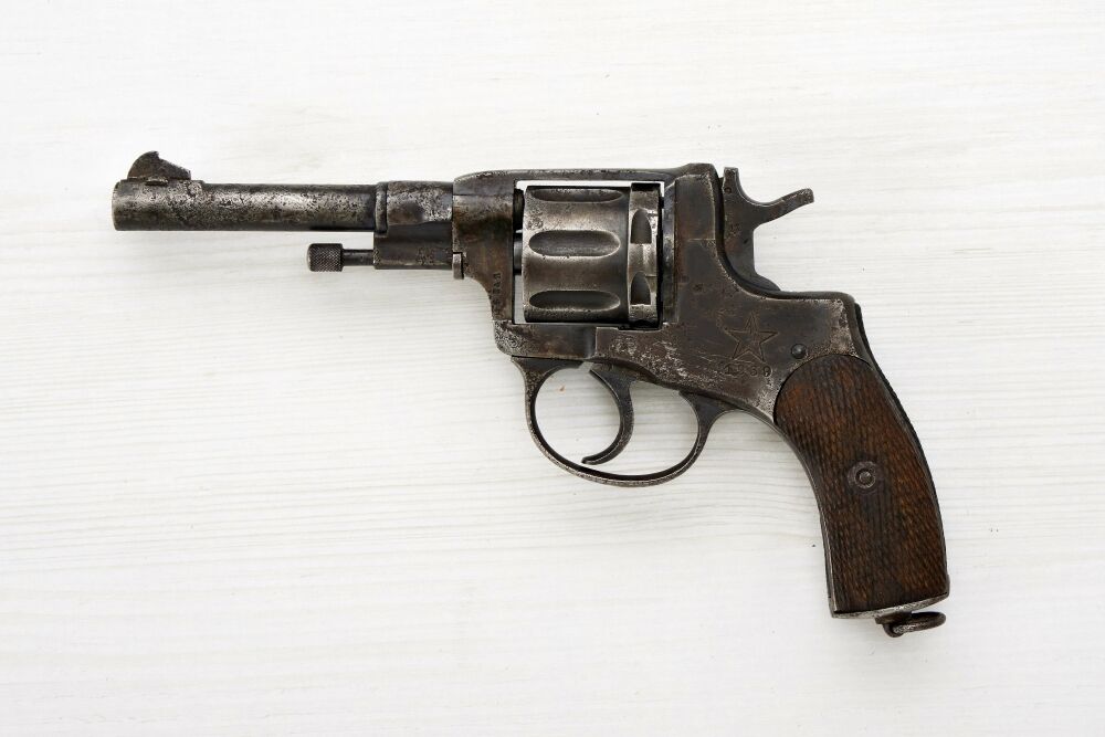 Revolver russisch Nagant Modell 1895 Kaliber 7,62mm Nagant, Seriennummer 46242, nummerngleich. Stellenweise rostfarbiger russischer Revolver Nagant im Kaliber 7,62 mm Nagant aus dem Jahr 1939 aus Tula Fertigung. Linke Rahmenseite vor Trommel Seriennummer sowie oberhalb Griffschalen Logo der Tula-Werke darunter 1939. Diverser Stern der Tula-Fertigung am Abzugsbügel und Hahn. Holzgriffschalen mit Fischhaut. Erwerbscheinpflichtig !