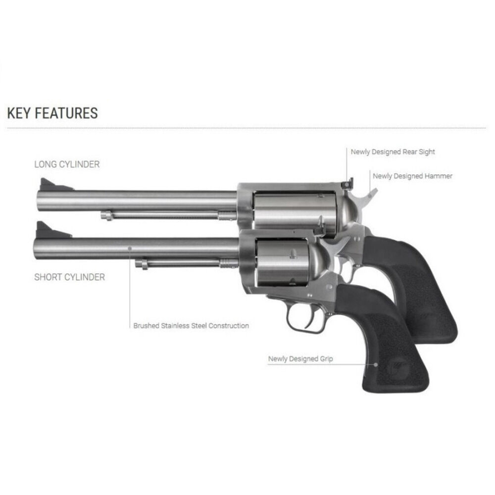 Kaliber .45-70Gov, Single Action Revolver BFR Long Cylinder 5/fünf Patronen, Lauflänge 10"/25,4cm, Brushed Stainless Steel, Abzugsgewicht zwischen 3lbs/1.362gramm bis 4lbs/1.816gramm ab Werk, LPA Visier Höhe und Seite verstellbar, Gesamtgewicht 4,7lbs/2.134gramm ohne Munition, Hogue Gummigriff schwarz, mit 1/einer Optik Montageschiene Weaver Style inclusive Befestigungsschrauben, 1/einem Visierverstellschlüssel und 1/einem Griffbefestigungstool, Magnum Research USA.