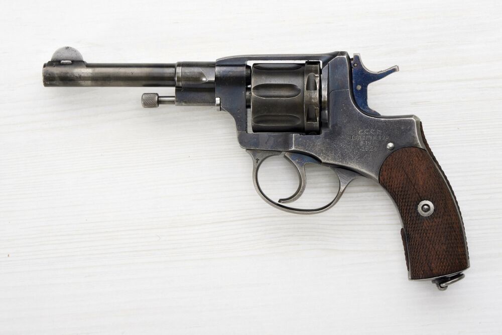 Revolver officer model 1895 Nagant in caliber 7.62 mm Nagant ( 7.62 mmx38 R) in very good condition partially at the muzzle minimal, inconspicuous scarring. Weapon marked on frame as follows: serial number as well as manufacturer and year C.C.C.P. etc. see picture. Various factory acceptance marks on frame, barrel. Weapon with original bluing, various parts still blue tempered, no proof marks. Brown wooden grip panels with checkering. Subject to purchase certificate!