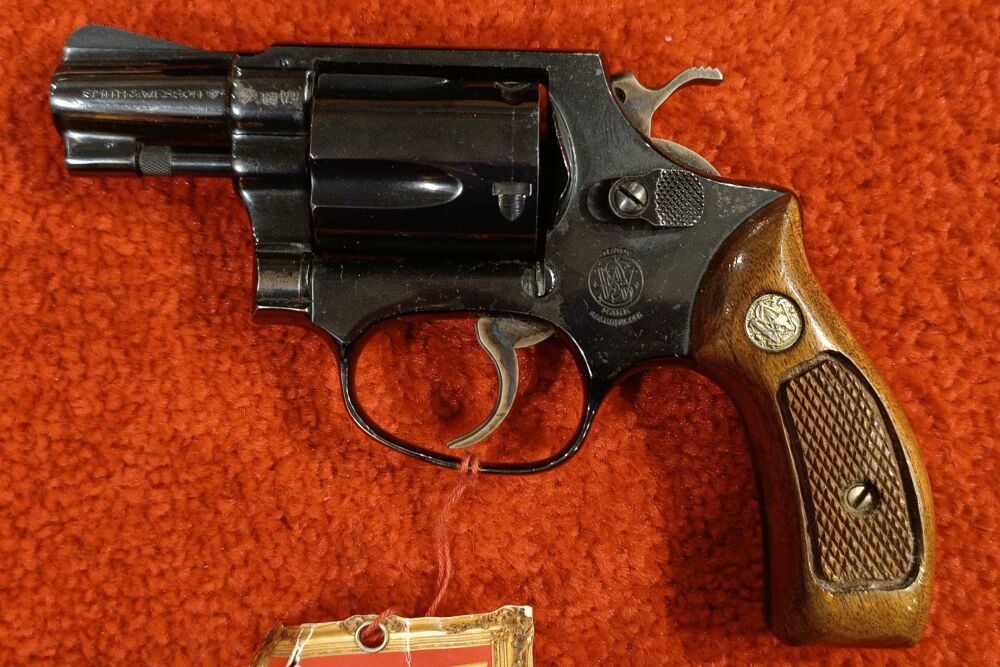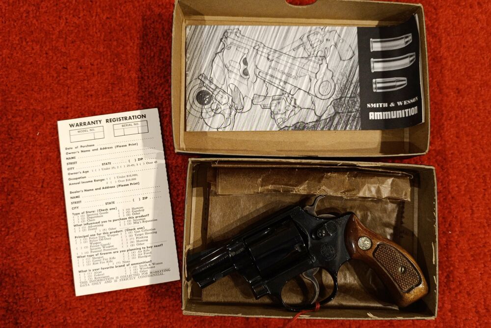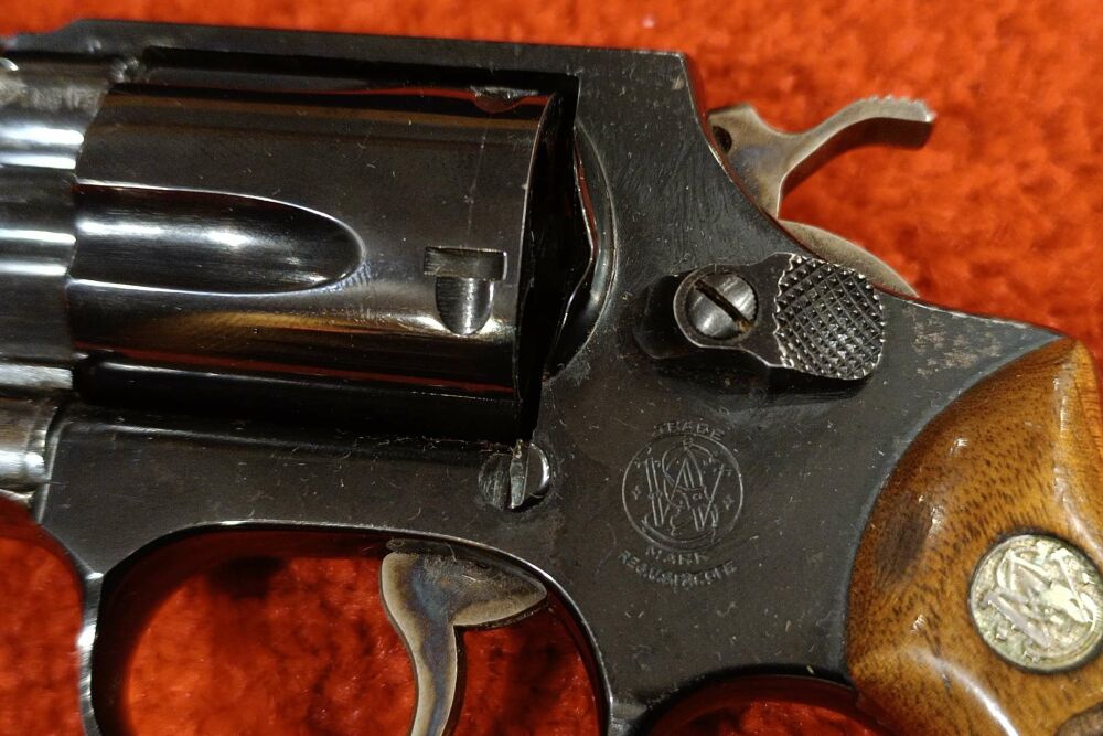 Revolver Smith & Wesson .38Special+ Lauflänge 4,5cm+ Lauf hat innen Spuren+ Holzgriffschalen + Ausschwenkbare Trommel + Fünf Schuss Trommel+ Original Verpackung+ Unterlagen vorhanden+ Kimme und K... ...weiterlesen
