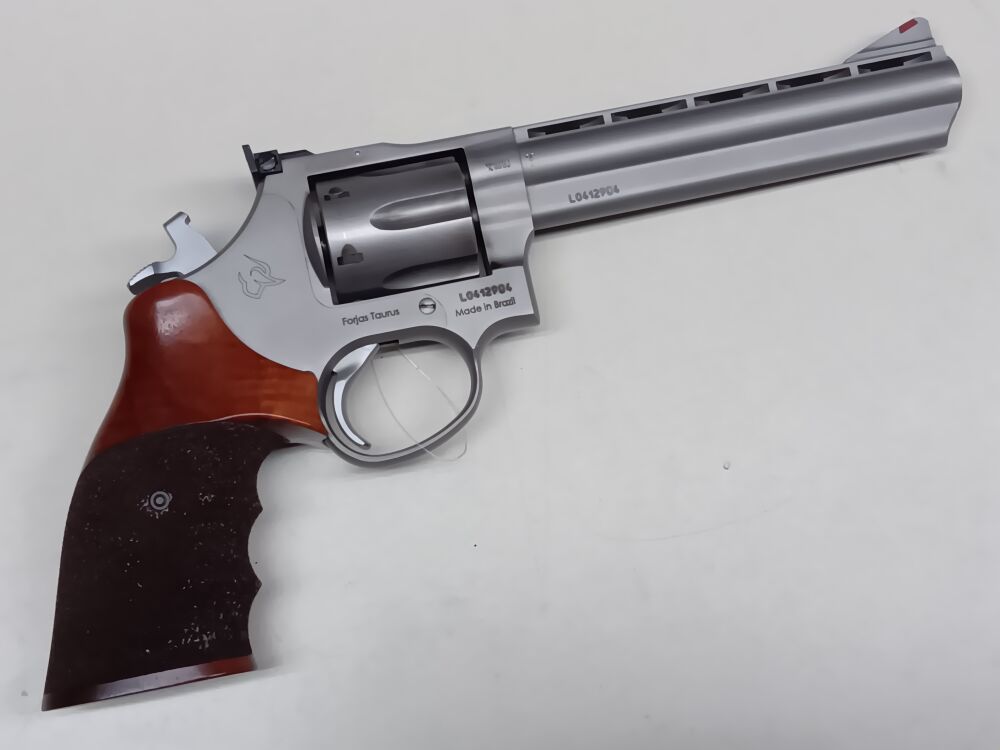 Brasilianischer Ganzstahl-Revolver in Smith & Wesson-Look , Gesamtlänge 29 cm , der 154 mm lange Lauf ist innen spiegelblank , ventilierte Laufschiene , Double-Action Abzug , höhen-und seitenverstellbares Kimmenblatt , festes Balkenkorn mit Kunststoffeinlage , originaler gecheckerter Holzformgriff , 6-schüssige Trommel , makellose Mattstainless-Oberfläche , Deutscher Beschuß von 2018