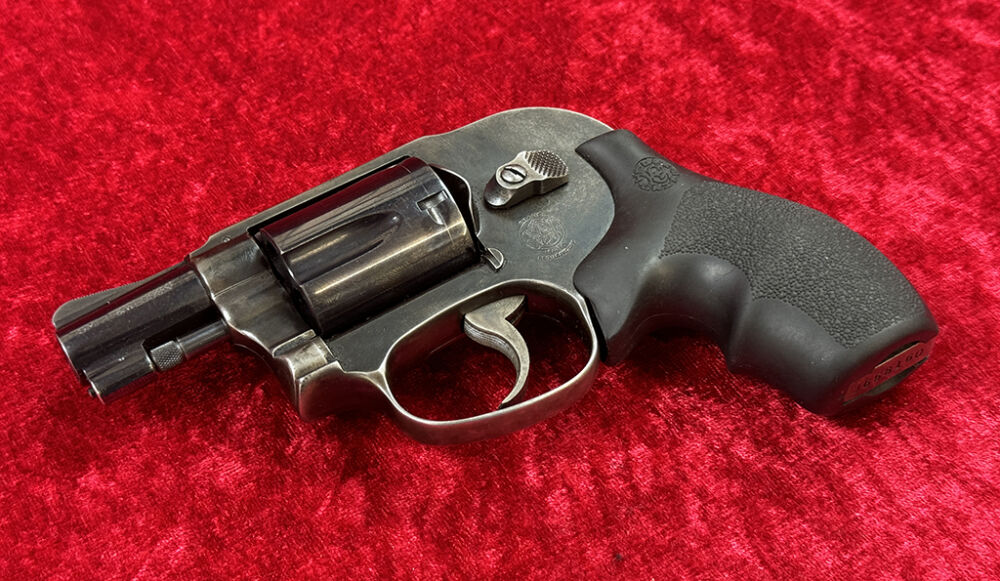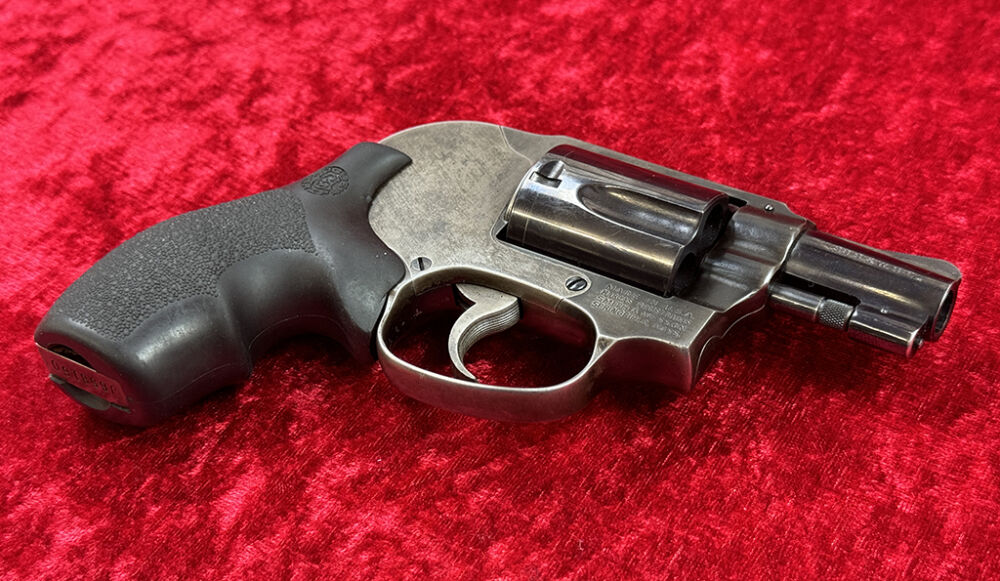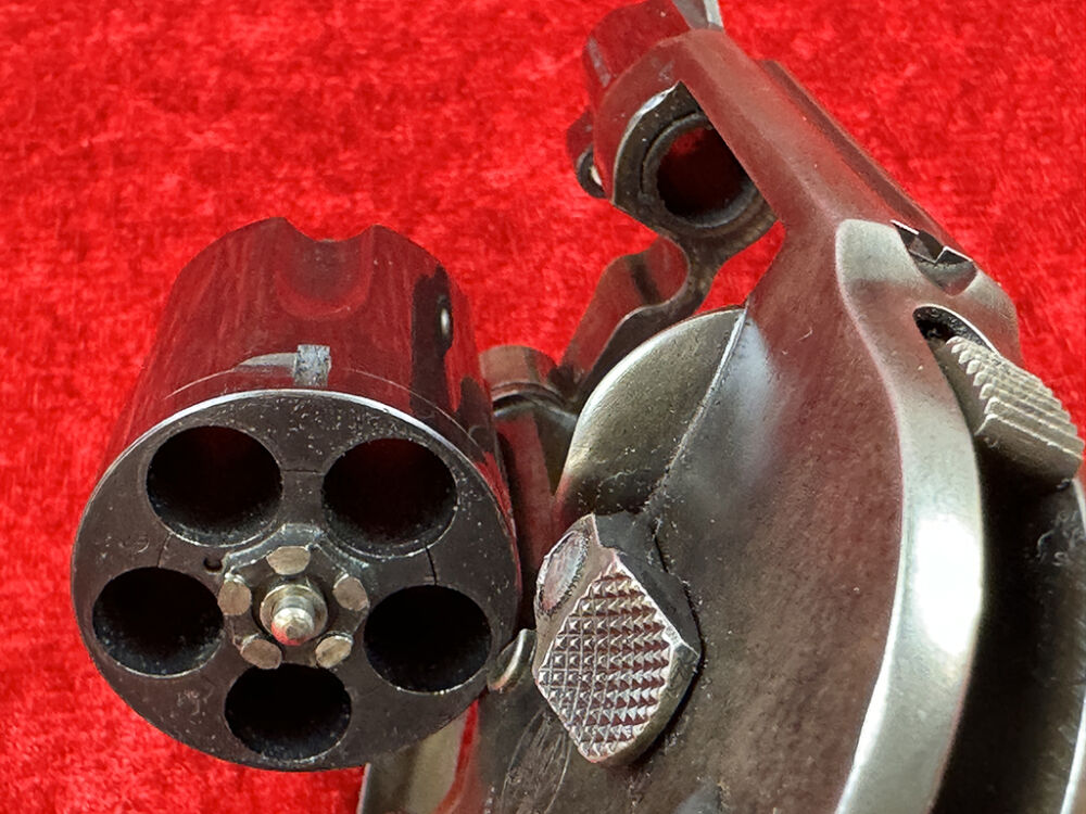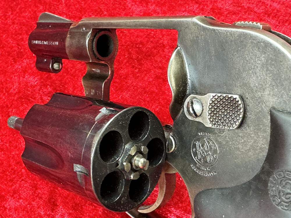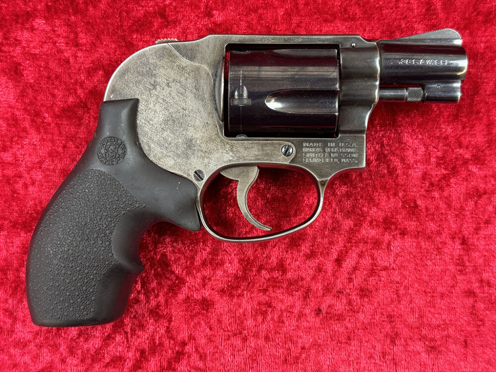 Dieser Smith & Wesson Revolver Model 49 Bodyguard ist ein Ganzstahlrevolver und kommt von einem Waffensammler der ihn wohl nie geschossen hat. Durch seinen verdeckten Hammer ist er perfekt zum verdeckten Tragen. Der mittele K-Frame Revolver hat einen 4,8 cm (1 7/8 Zoll) Lauf, eine 5-Schuß Trommel und einen Hogue Gummigriff.. Die Waffe wurde laut Seriennummer 1978 produziert, und im Beschußamt München beschossen.