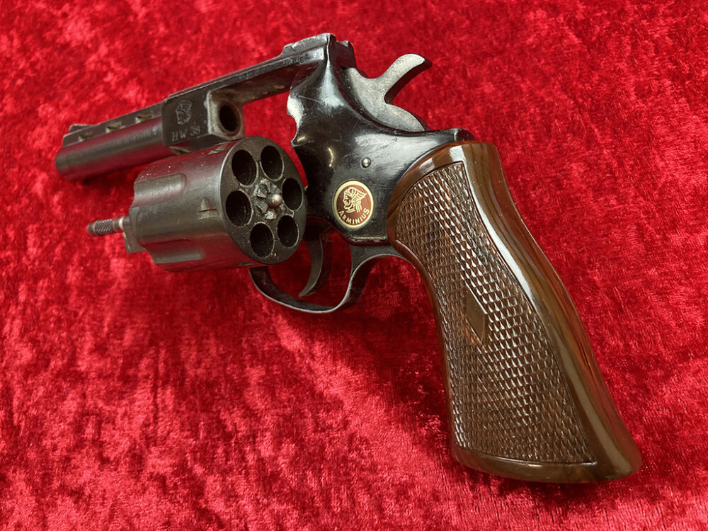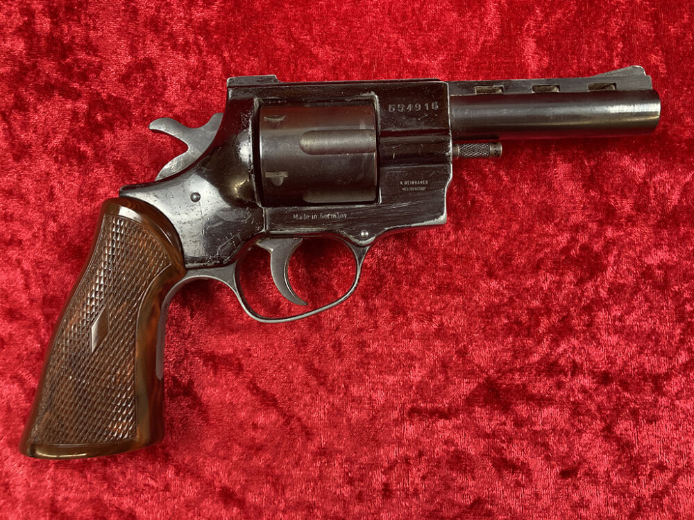 Dieser Revolver hat eine Lauflänge von 10 cm (4 Zoll) und wurde 1976 beim Beschußamt München beschossen. Die Trommel fasst 6 Schuß. Dazu gibt es ein passendes Lederholster. Ein guter Fangschußrevolver für kleines Geld.