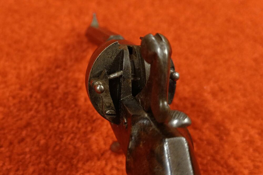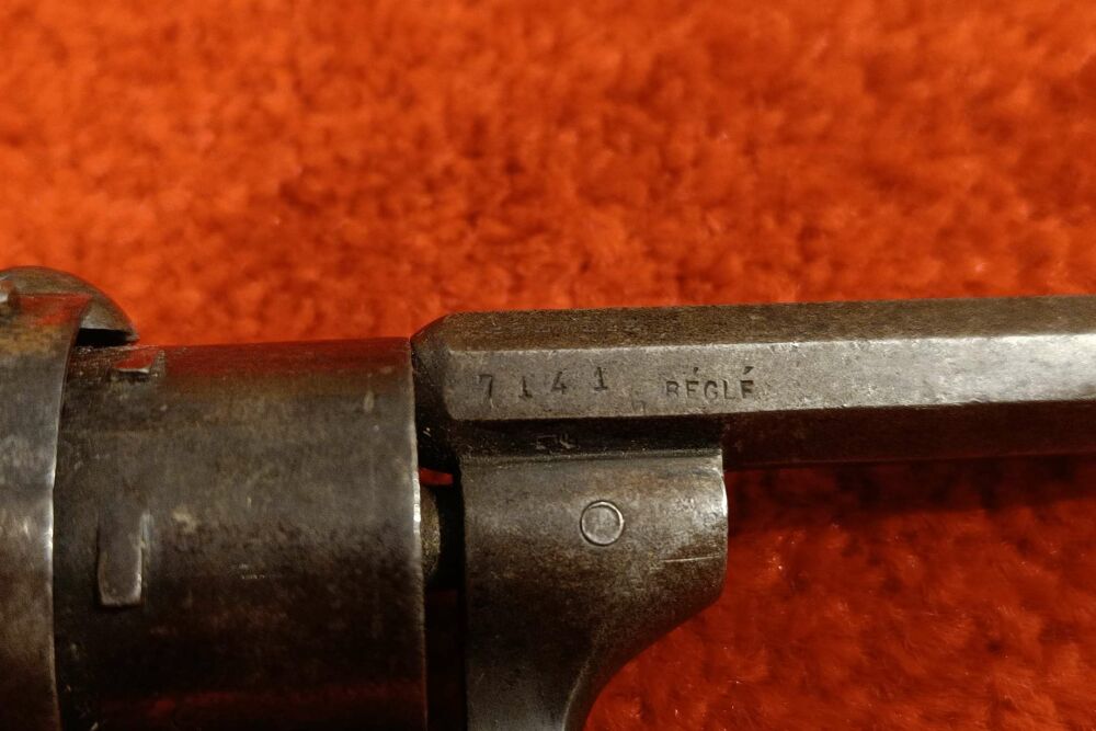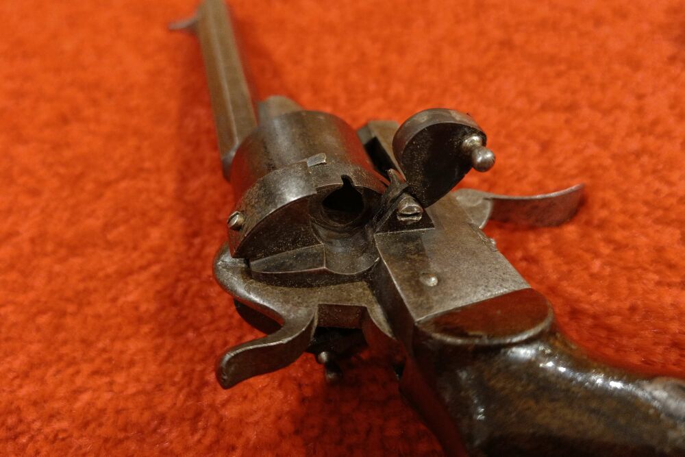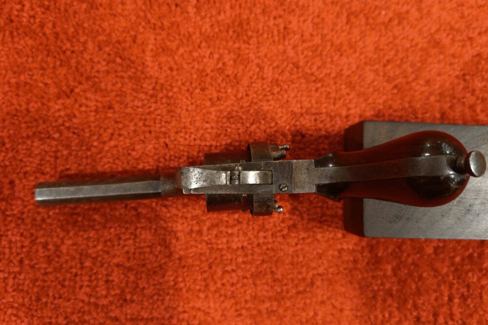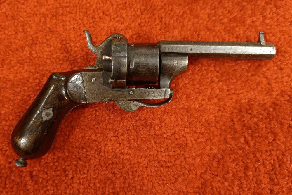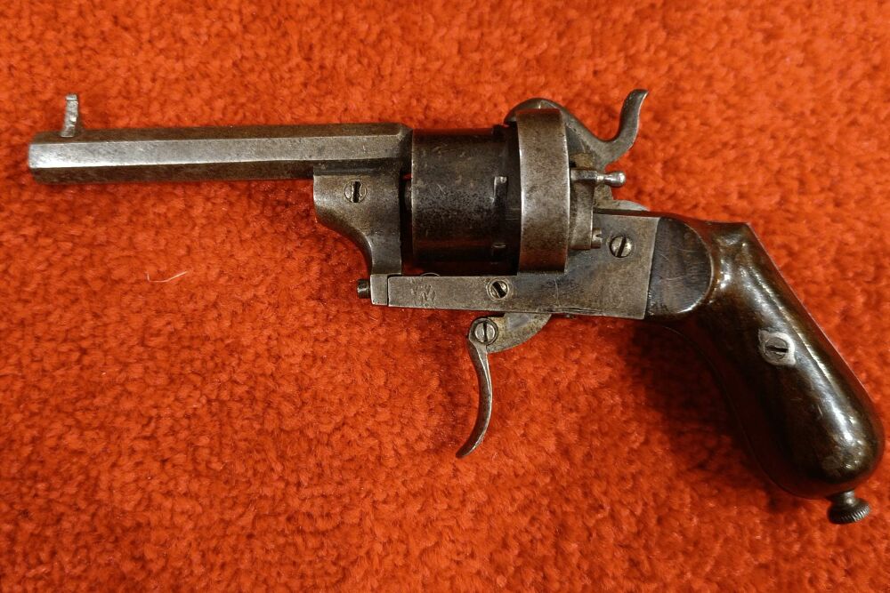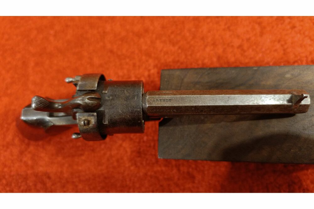 Revolver Arendt 7mmLefaucheux + Lauflänge 8,5cm+ Lauf innen dem Alter entsprechend + Holzgriffschalen + Ladeklappe + Sechs Schuss Trommel + Sicherung vorhanden + Korn vorhanden ...weiterlesen