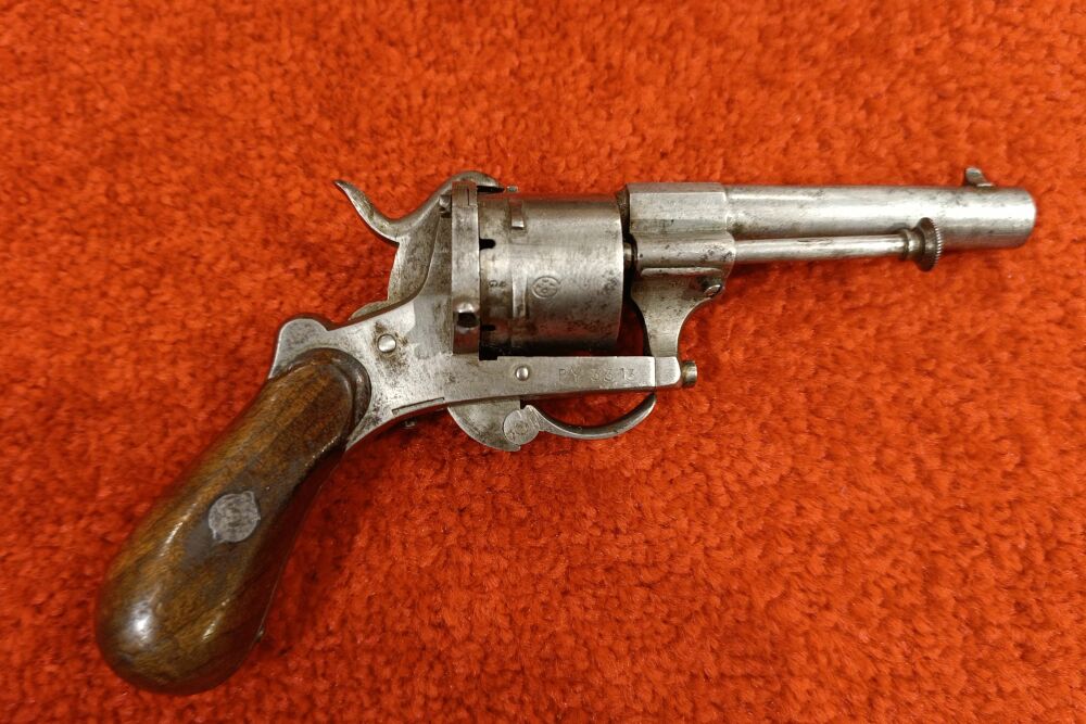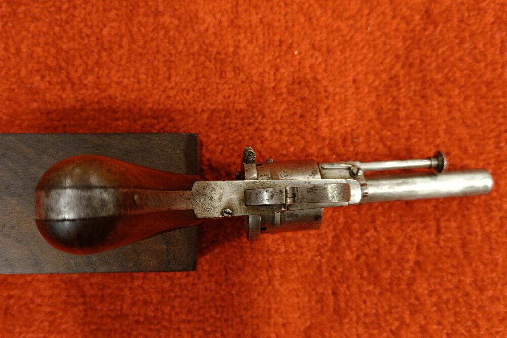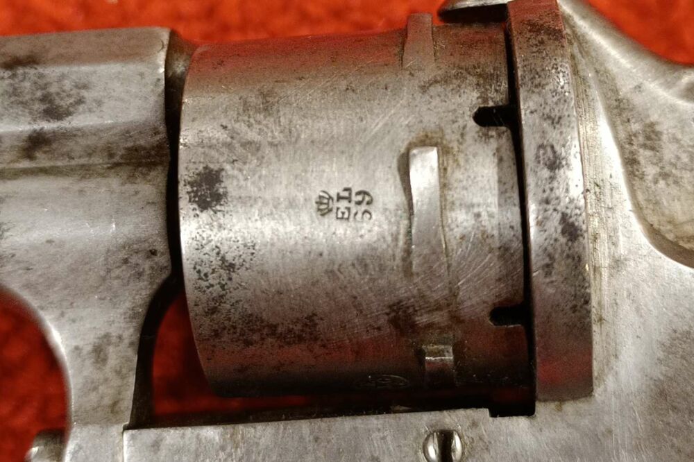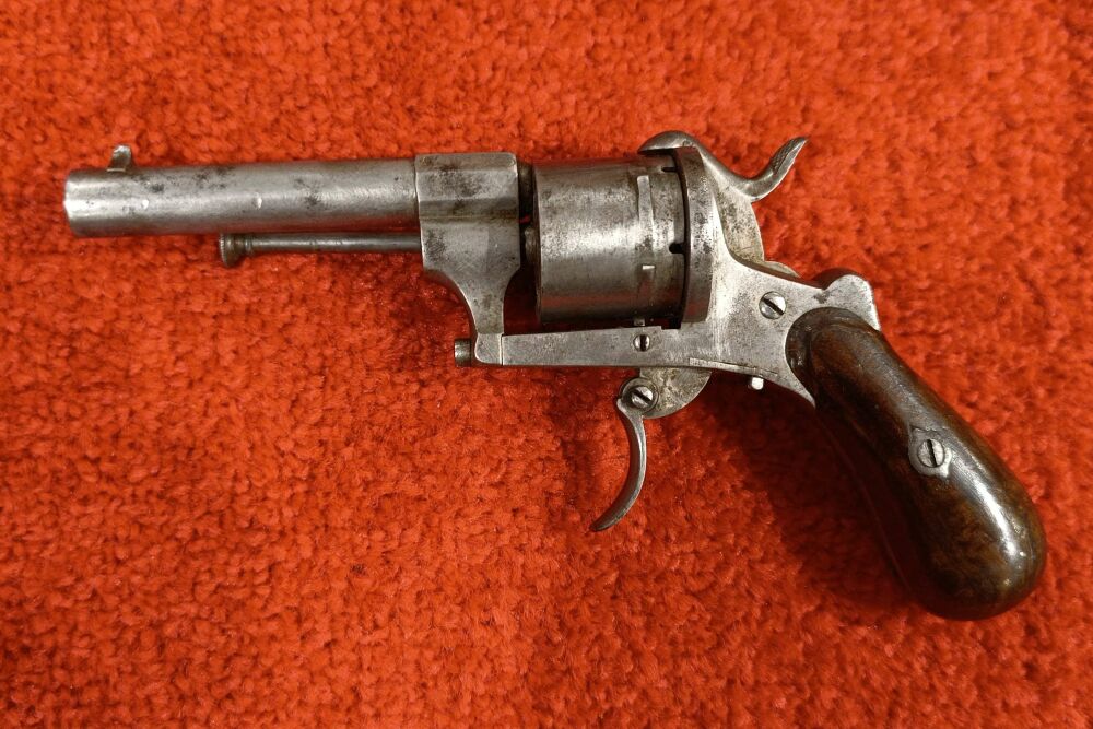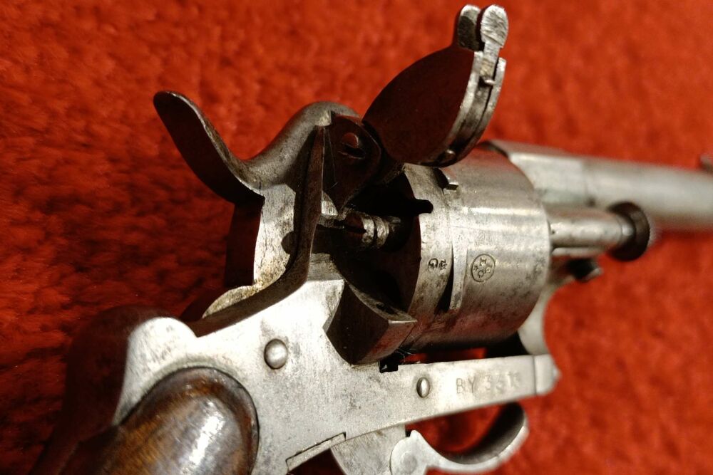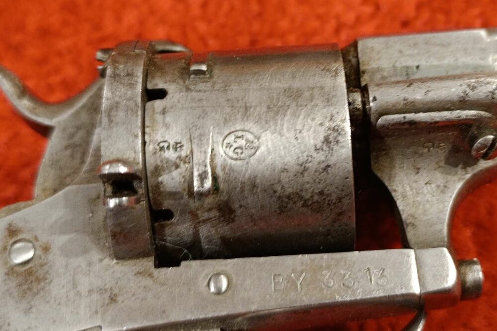 Revolver unbekannt 7mmLefaucheux+ Lauflänge 8,5cm+ Lauf innen dem Alter entsprechend + Holzgriffschalen + Sechs Schuss Trommel + Ladeklappe Korn vorhanden + Klappabzug ...weiterlesen