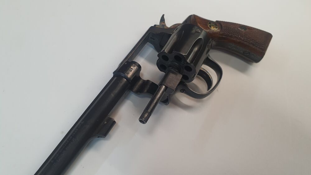 Der Revolver ist ausgestattet mit 6-Schuss ausschwenkbarer Trommel und Hülsenauswerfer.