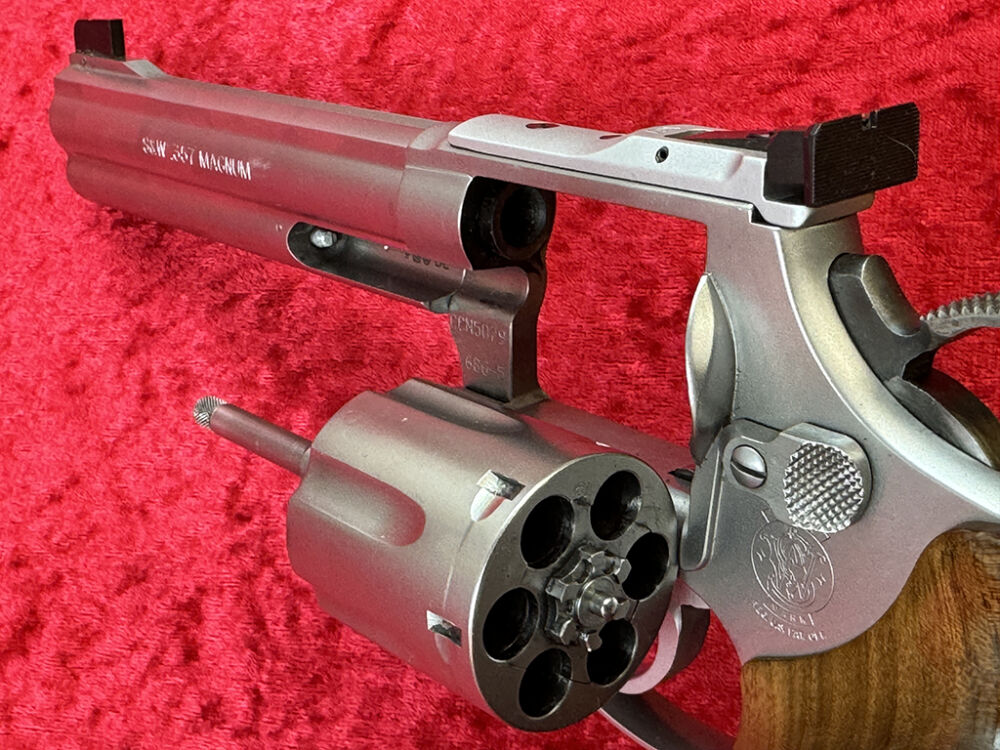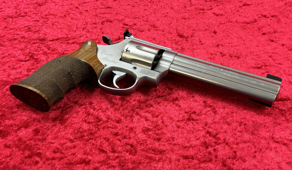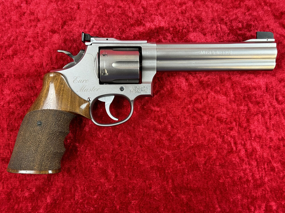 Dieser Revolver stammt von einem Sportschützen und Waffensammler. Der kaum geschossene Smith & Wesson Revolver ist für das sportliche Schießen, aber durch seinen 15 cm (6 Zoll) Lauf für die Nachsuche geeignet. Der Griff ist ein Rechtshänder Formgriff der Firma Karl Nill. Der Rahmen ist ein mittelgroßer L-Frame. Er hat ein langes Ausstoßergehäuse und die geflutete Stahltrommel faßt 6 Schuß. Laut Seriennummer wurde die Waffe 1998 produziert und über Belgien eingeführt. Die Waffe verfügt über einen belgischen Beschuß und zusätzlich noch über einen CIP Beschuß 2022 vom Beschußamt Mellrichstadt, da der Revolver einen neuen Lauf bekommen hat.