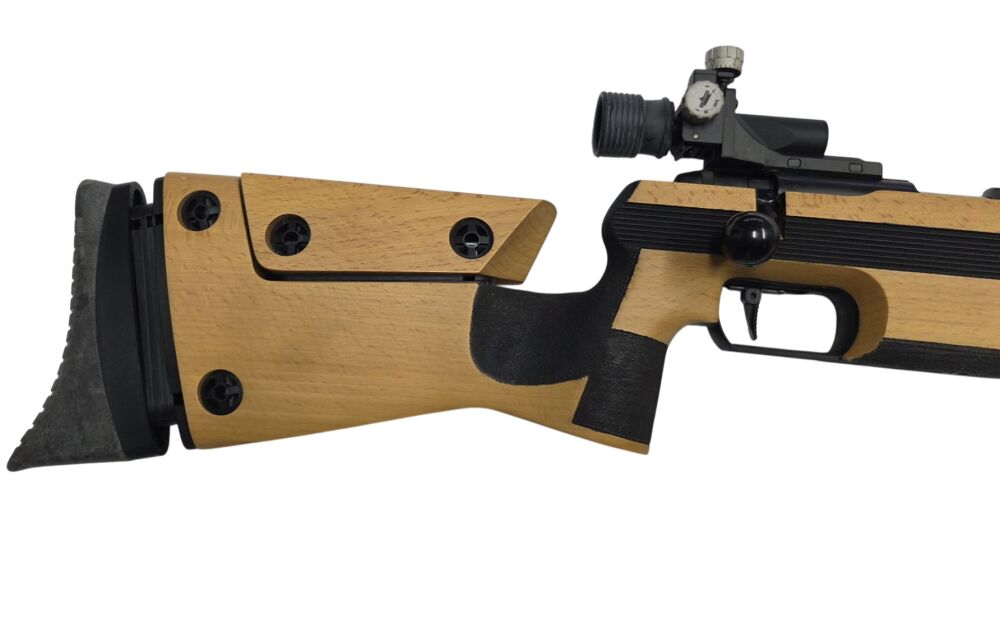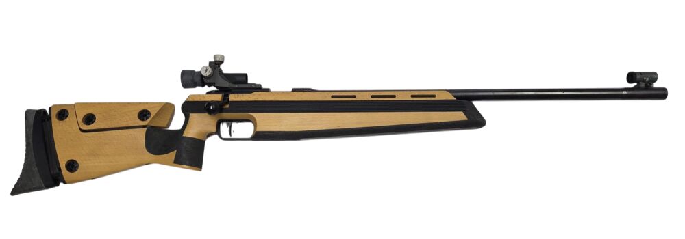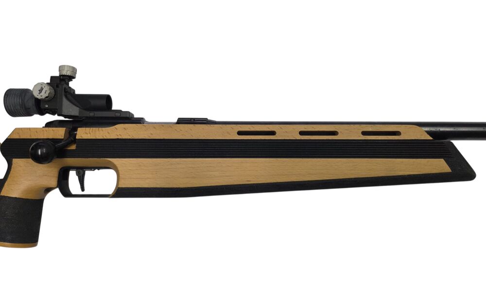 Einzellader von Anschütz im Kaliber .22lr. mit ergonomischer Wangenauflage und vertsellbarem Schaft. Die Visierung(Diopter) und der Korn Tunnel  ist von Anschütz. Die Waffe ist im Einwandfreien Zustand und hat wenige Gebrauchsspuren.
