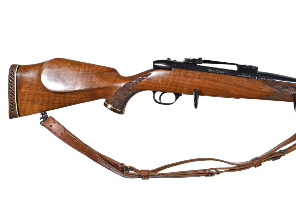 Diese Weatherby Mark V im Kaliber .300 WinMag ist eine Repetierbüchse mit Linkssystem. Die Waffe hat eine Gesamtlänge von 112 cm, eine Lauflänge von 61 cm und eine Schaftlänge von 34 cm. Der Holzschaft ist in einem guten Zustand mit normalen Gebrauchsspuren. Die Waffe ist zudem mit einem Riemen und Riemenbügeln ausgestattet.