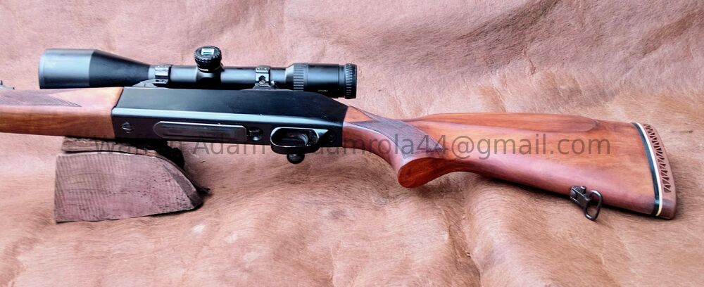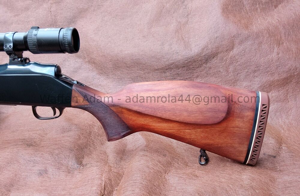 mittelbrauner Nussholz Schaft, Monte Carlo Effekt und Pistolengriff, ventiltierte Gummi Schaftkappe. Riemenbügel mit Patent Verschluss. 350mm Schaftlänge, 1120mm Gesamtlänge.
