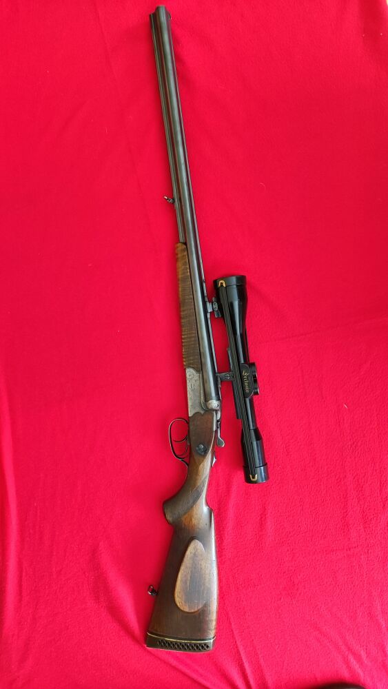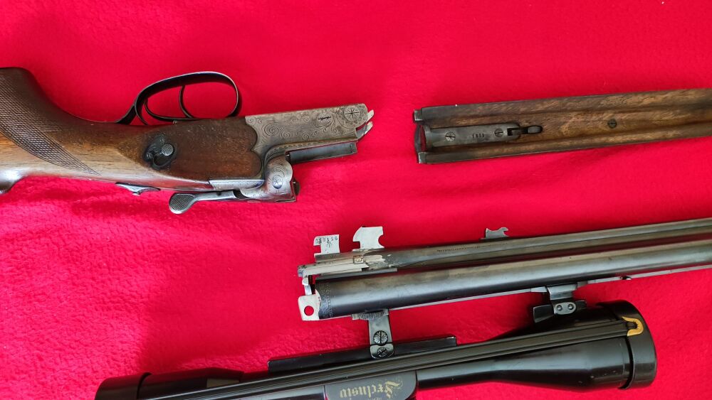 Wir bieten einen Suhler Drilling Kaliber 16/16/70 , 7x57R. Im rechten Schrotlauf ist ein laufmündungsbündiger Einstecklauf Kal. .22 Hornet. Das Gewehr hat Greener Querriegelverschluß und doppelte Lau... ...weiterlesen