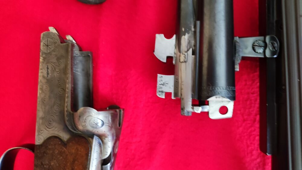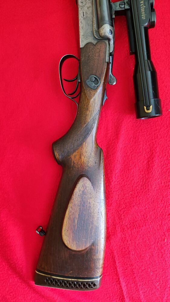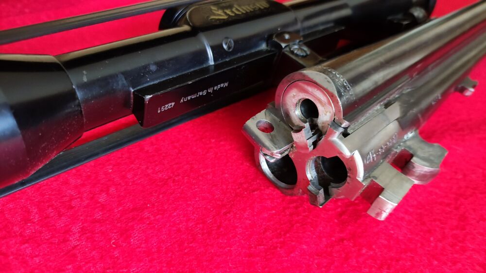 Wir bieten einen Suhler Drilling Kaliber 16/16/70 , 7x57R. Im rechten Schrotlauf ist ein laufmündungsbündiger Einstecklauf Kal. .22 Hornet. Das Gewehr hat Greener Querriegelverschluß und doppelte Laufhakenverriegelung. Die Verriegelung der Waffe ist absolut dicht. Der Hornet Einstecklauf ist mündungsbündig. Alle Läufe sind innen einwandfrei, kein Rostansatz. Auf das Gewehr ist mit Suhler Einhakmontage ein Zielfernrohr Hertel und Reuss, 6 x 46, Absehen 1, montiert. Die Zielfernrohrlinsen sind einwandfrei, keinerlei Fummeleispuren. Die Zf-Montage ist passgenau und fest. Am Nußbaumschaft ist eine Gummiabschhlußkappe. Auf dem Systemkasten und dem Abzugsbügel ist eine Arabeskengravur.