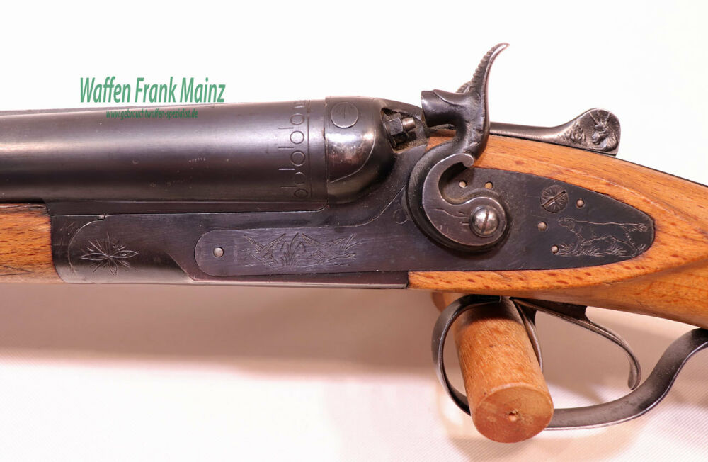 selten geschossene Schrankwaffe, mit außenliegenden Rückspringer-Hahnschlössern, Doppelabzug, Choke 1/2-1/1, neutraler Pistolengriffschaft, Schaftlänge 365mm, noch aus guter, alter Fertigungsqualität aus Stahl....für den Liebhaber von Hahnwaffen, sichere Flinte für Hundeführer und bei Nachsuche....