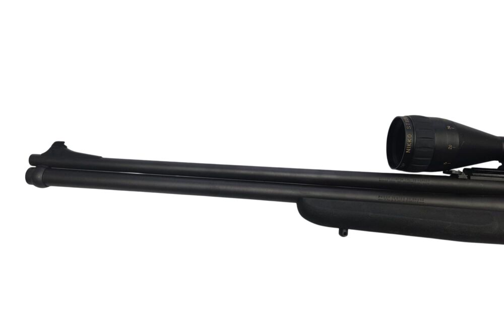 Es handelt sich hier um eine Bockbüchsflinte im Kaliber .22Hornet und 20/76. Eignet siche für den Jäger als Schonzeitwaffe für Niederwild. Die Waffe wird mit einem Nikko Sterling 4-12x42 AO.