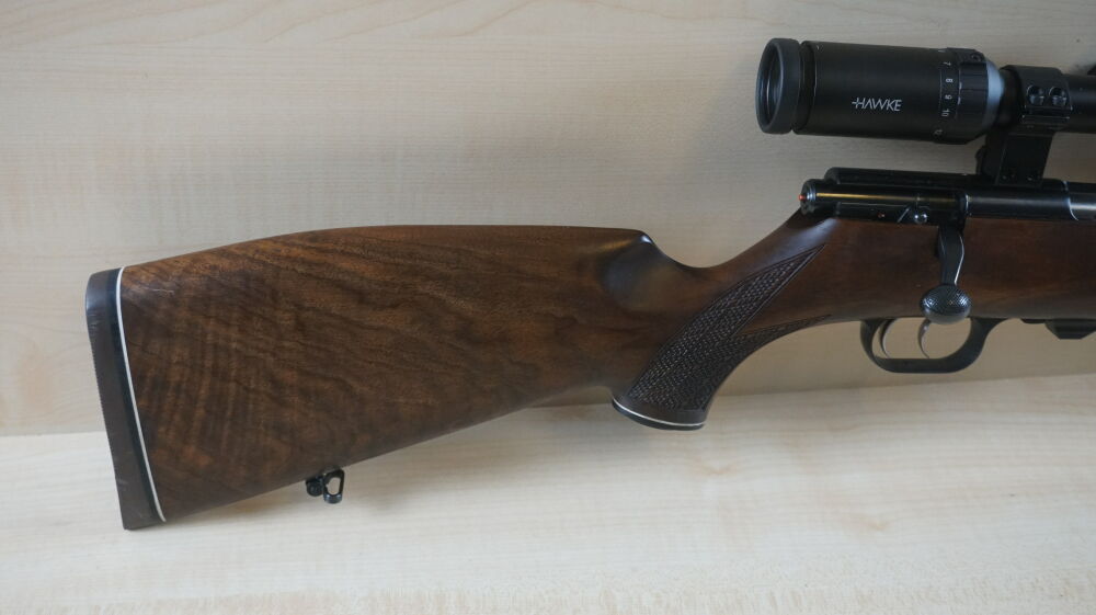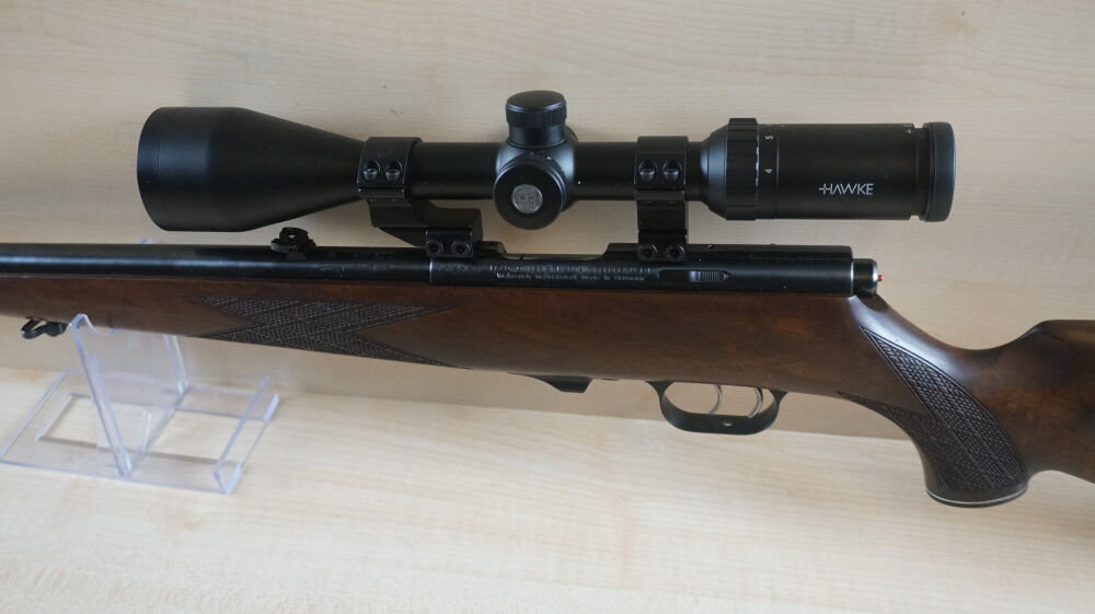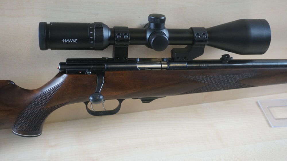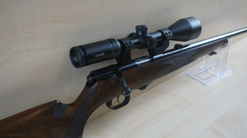 Repetierbüchse Weihrauch, Modell HW 60 J im Kaliber 17 HMR mit Lauflänge 50 cm und Mündungsgewinde, deutscher Stecher, 4 Schuß Magazin, Aufschubmontage , Zielfernrohr Hawke, Vantage 4 - 12 x 50 Leuchtabsehen 4.