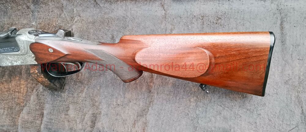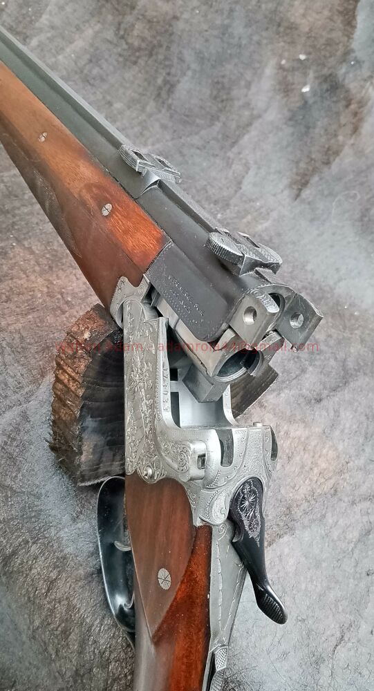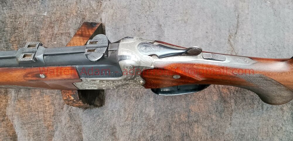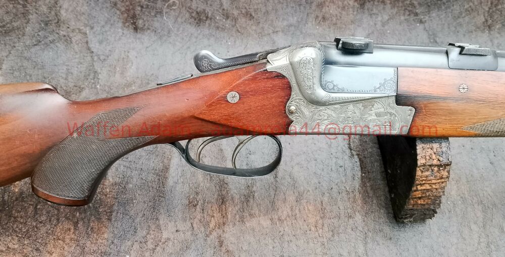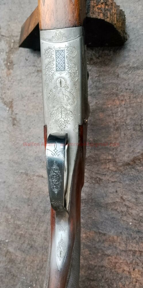 Kolbenhalssicherung, Gravur: Fuchs, Fasan, rechts Fasan Gruppe, Arabesken Nussholz Schaft mit Deutscher Backe , Pistolengriff und geradem Schaftrücken, Schaftkappe. Funktion einwandfrei, Verschluss saugend und fest, normale Gebrauchsspuren.