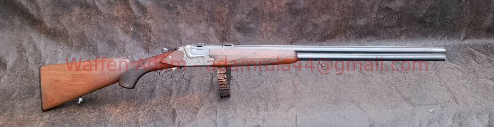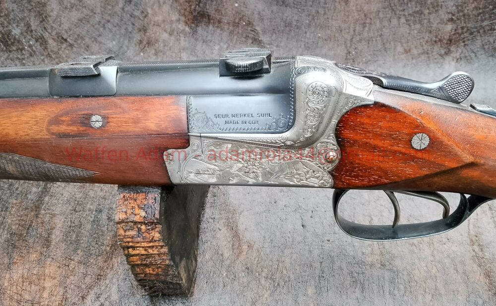 Bockflinte der alten Suhler Büchsenmacher, Merkel Modell 201e mit sauber gravierter Basküle, geteilter Vorderschaft, Ejektor, Signalstifte, Kersten und doppelter Laufhaken. Vorderer Abzug mit Gelenk, Gesamtlänge: 1130, Lauf: 710 Schaftlänge 360mm