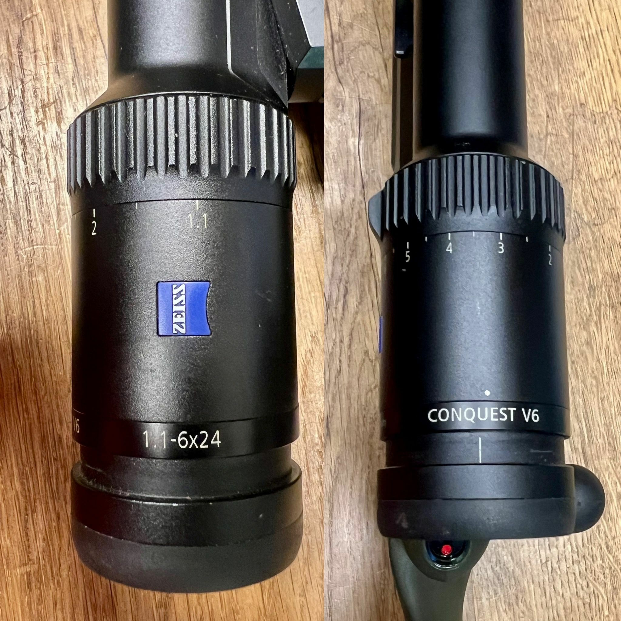 Auf der Waffe ist per Dentler Montage ein Drückjagdglas von Zeiss, Conquest V6 1,1-6x24 mit Leuchtpunkt montiert.
