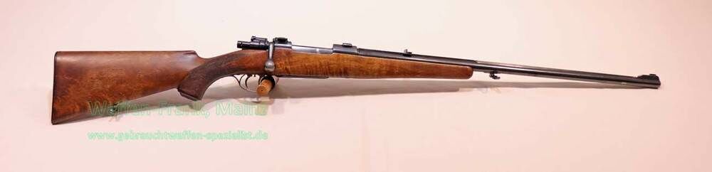 Einzelanfertigung mit einem Mausersystem M98, verkauft und ausgeliefert durch Fa. Georg Honold, Ulm, und mit einer Suhler-Einhakmontage versehen, vordere Fußplatte fachlich im System eingeschuht, (ZF leider nicht mehr vorhanden, jedoch baugleiche aus dieser Zeit können wir zum Teil beschaffen, montieren oder die vorhandene Montage auf Schwenkmontage umbauen), mit voller Beschriftung und Beschuss von 1934 (noch kaiserlich), mit konischem Lauf, Mündungsdurchmesser 15mm und aufgesetzter, durchgehender Laufschiene, mit eingesetztem Klappenvisier, eleganter zierlicher, gut gemaserter Nussbaumschaft mit deutscher Backe für Rechtsschützen, Schaftlänge 360mm einschl. original Hornkappe, Lauf spiegelblank, mit bester Schussleistung....für den Kenner feiner, klassischer Jagdwaffen....EUR 795,-