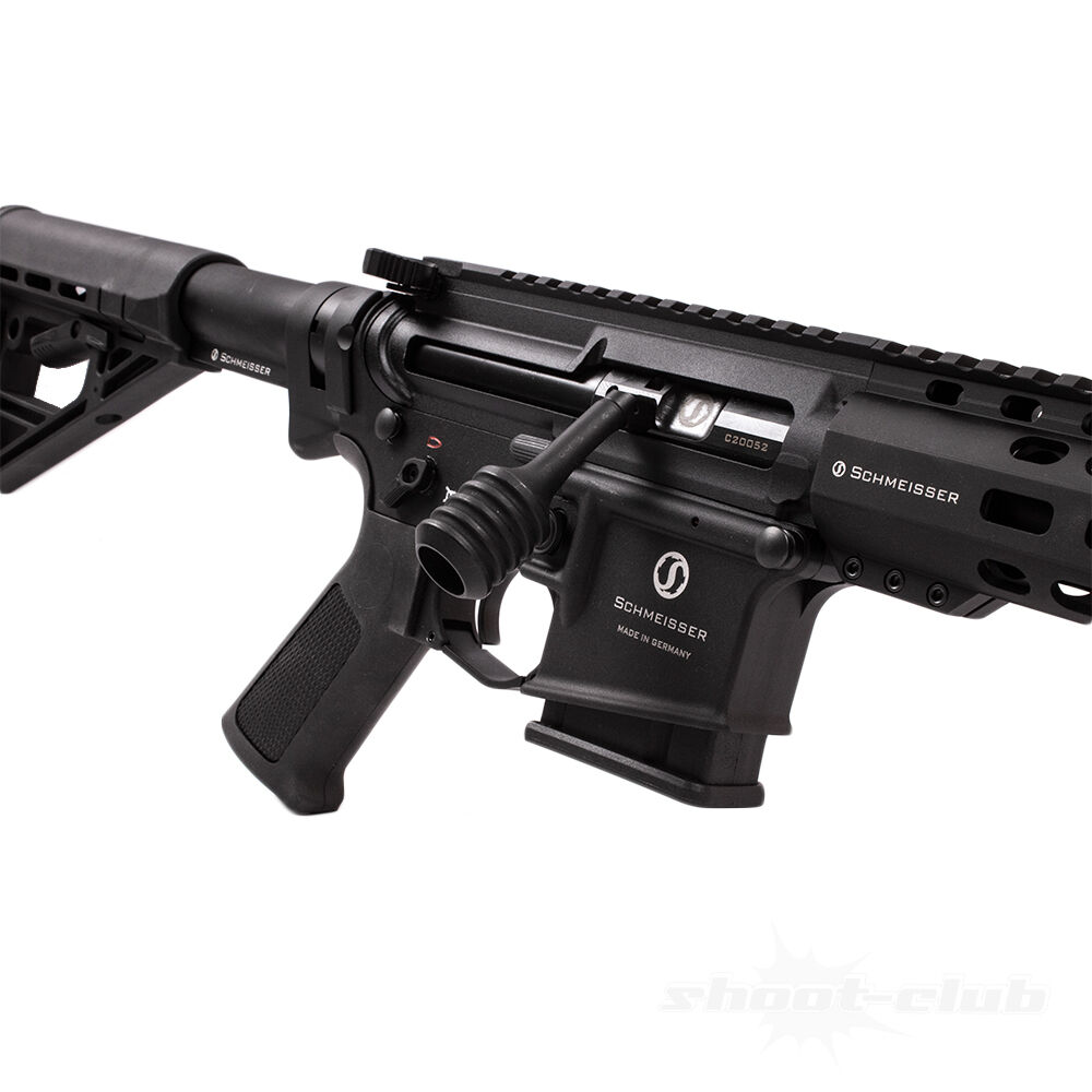 Die Schmeisser SP15 besitzt ein nach Mil-Spec geschmiedetes Gehäuseunter- und -oberteil aus 7075 T6 Aluminium, welches gefräst und harteloxiert wurde. Des Weiteren kann die Schmeisser mit einem Free-Floated Handschutz, einem verstellbaren Hinterschaft und dem Staufach im Pistolengriff überzeugen. In der Straight Pull Variante ist der Erwerb auf gelbe WBK möglich.