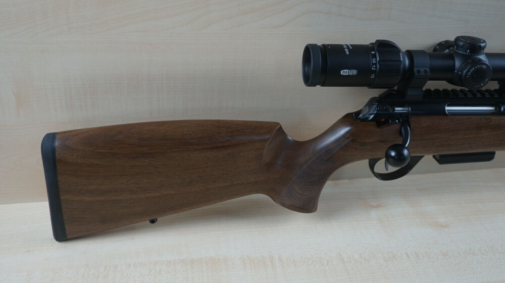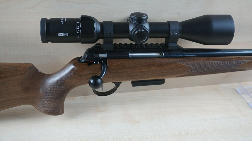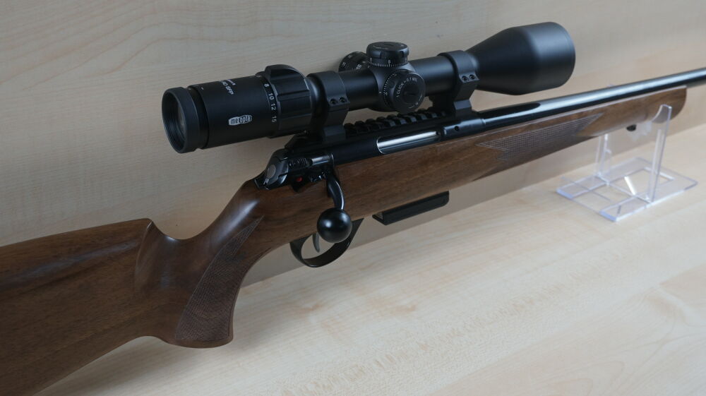 Repetierbüchse Anschütz, Modell 1771 im Kaliber 17 Hornet mit deuschem Schaft, 51 cm Lauflänge mit Mündungsgewinde, Matchabzug, 4 Schuß Magazin, Weaverschiene, Weaver - Ringmontage, Zielfernrohr Meopta, Meo Sport 3 - 15 x 50 Leuchtabsehen 4.