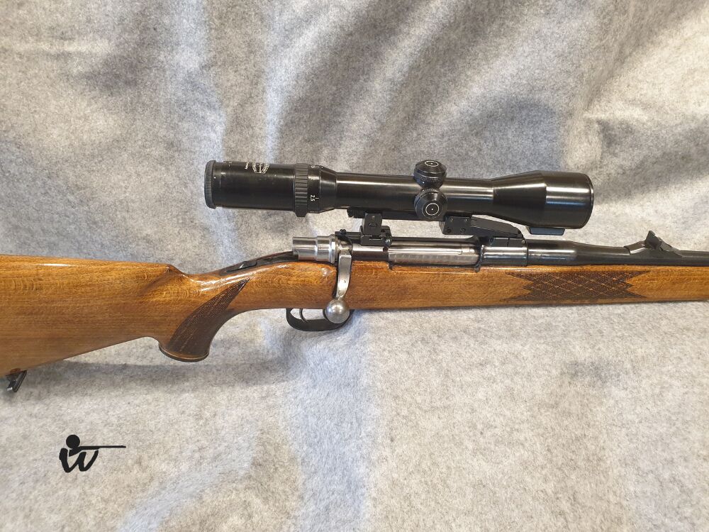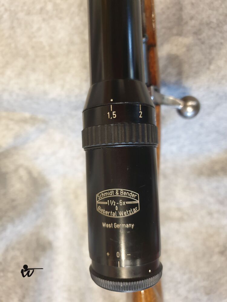 Ebenso mit zur Büchse gehört ein variables Zielfernrohr von Schmidt&Bender in der Variante 1,5-6x42 mit Abs.1, montiert über eine EAW-Schwenkmontage. Dieses macht die Büchse flexibel einsetzbar, sei es vom Ansitz bis zur Drückjagd. Zudem verfügt über Sie über einen deutschen Stecher und die auf dem Kolbenhals montierte Schiebesicherung, die die Kammer blockiert und den Abzug sperrt, sorgen für eine sichere Handhabe. Der helle Lack Schaft hat eine Länge vom vorderen Abzug von 37,5 cm und wird von 2 Riemenbügeln ergänzt. 98er-Typisch sei noch das 5-Schuss Kastenmagazin zu erwähnen.