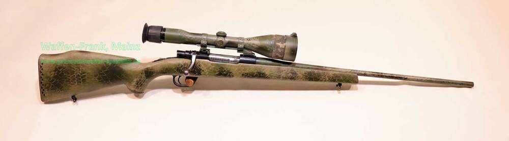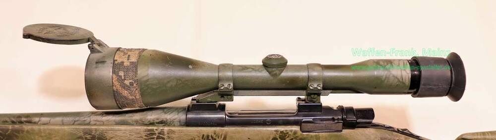 in Hobbyarbeit gefertigtes Unikat unter Verwendung eines neugefertigten verbesserten Mausersystem, mit Schiebesicherung auf dem Kolbenhals, Stecherabzug, abklappbarer Kastenboden, visierloser konischer Lauf, mit Mündungsdurchmesser 16mm, Original EAW-Schwenkmontage mit ZF Zeiss Diatal 8x56 Absehen 1, Stahl-, Holzteile und Optik in Camouflage-Look überarbeitet...robuste zuverlässige Ansitzwaffe mit dem Universalkaliber für ganz Europa....