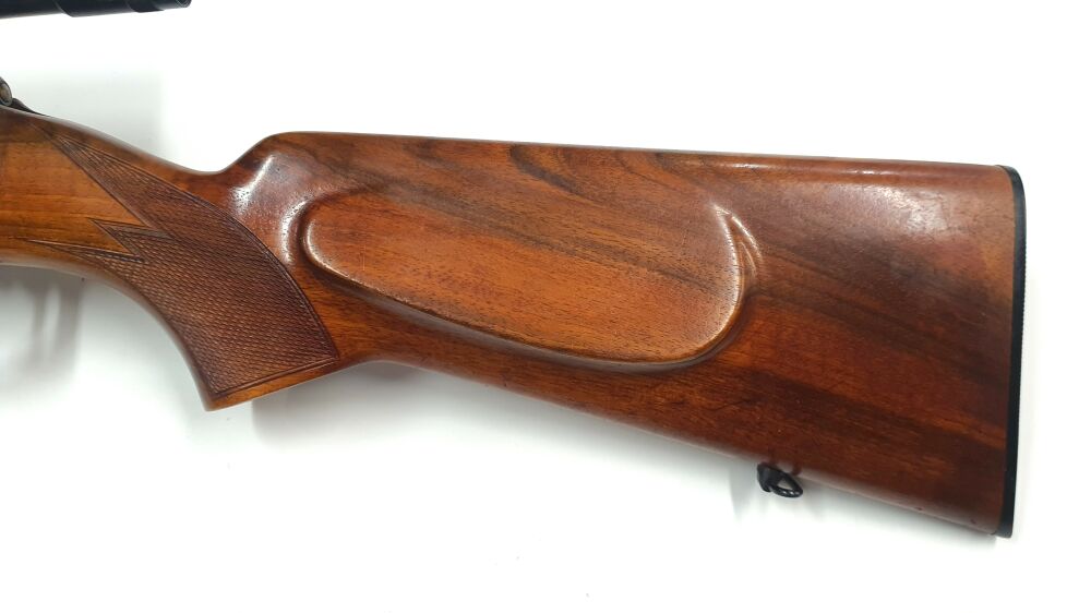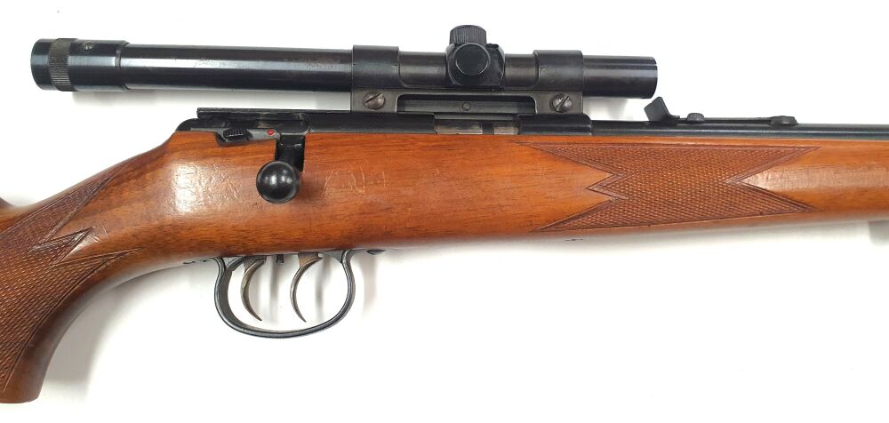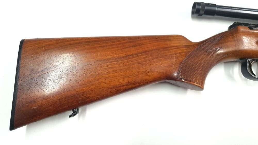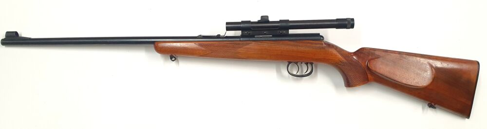 Anschütz Einzelladerbüchse -4mmRF Lang mit Stecher und Zielfernrohr. Guter Zustand, kleinere Roststellen an der Brunierung. Zielfernrohr Haweka 2 1/2x