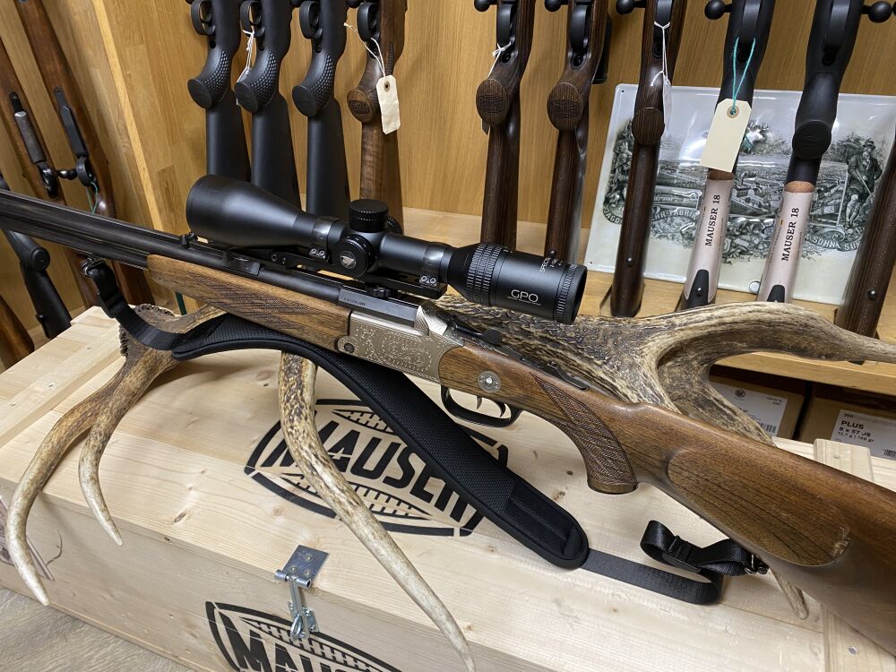 Zum Verkauf steht eine gebrauchte Bockbüchsflinte der Marke Blaser Modell ES 73 im Kal. 9,3x74 R / 12/70. Die Waffe wurde mittels eines Zimmermann Einstecklaufes im Kal. 5,6x50 R Mag. zu einem Bergstutzen umgebaut. Technisch sowie optisch ist die Waffe in einem guten gebrauchten Zustand, Gebrauchsspuren sind vorhanden. Auf der Waffe verbaut ist eine Henneberger Schwenkmontage mit einem Zielfernrohr GPO Spectra 6x 2-12x50. Zielfernrohr sowie Montage wurden im November 2025 neu montiert (Rechnung sowie Restgarantie vorhanden).